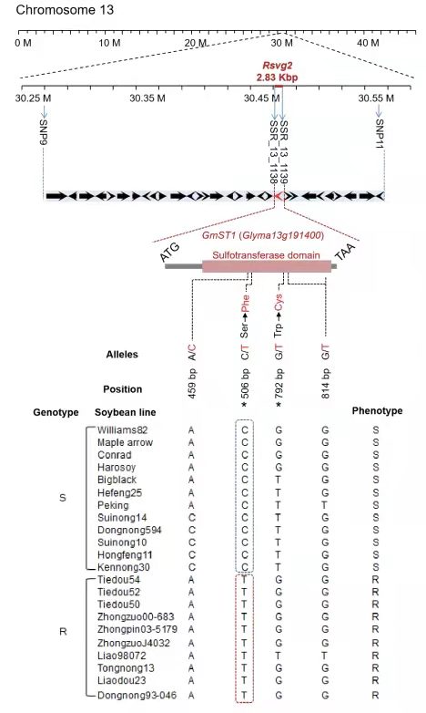 大豆[Glycine max(L.)Merr。]是一種在世界范圍內(nèi)種植的重要油料作物,是人類豐富的植物油和蛋白質(zhì)來源。但許多病原體優(yōu)先攻擊大豆。這些攻擊導(dǎo)致嚴(yán)重的產(chǎn)量損失和質(zhì)量下降。在全世界攻擊大豆的病原體中,大豆花葉病毒(SMV)是通過蚜蟲和感染的種子非持久性傳播的,是最廣泛和破壞性最大的疾病之一。SMV感染通常會使大豆產(chǎn)量降低10–30%,但在嚴(yán)重暴發(fā)時(shí),損失可能達(dá)到50–100%。根據(jù)大豆品種中SMV感染的癥狀,包括典型的葉片圖案,葉片變形,植物發(fā)育不良,頂部壞死和種子斑點(diǎn),將SMV菌株分為7種主要致病型:G1-G7。由于種子的可傳播性,所有主要大豆生產(chǎn)國都存在菌株致病型(G1-G7)。目前,有4個(gè)主要的SMV抗性基因座(Rsv1,Rsv3,Rsv4和Rsv5),大豆基因組的可用性加快了分子標(biāo)記的開發(fā)和Rsv基因座候選基因的鑒定。最主要的Rsv1基因座是最復(fù)雜的,它包含編碼NBS-LRR蛋白的基因簇,這個(gè)染色體區(qū)域還攜帶多種病原體抗性基因,一大類同源NBS-LRR序列聚集在Rsv1基因座上,據(jù)推測,DNA的兩個(gè)片段分別是3gG2(Glyma.13g190800的等位基因)和5gG3(Glyma.13g190000的等位基因),是Rsv1的最可能的候選基因,針對Rsv3,Rsv4也進(jìn)行了相關(guān)的研究。盡管針對每個(gè)Rsv基因座篩選了候選基因,但除了Rsv4以外,沒有一個(gè)關(guān)鍵基因被完全闡明。本研究中使用重組自交系RIL群體和F2分離群體,確定并精細(xì)繪制了SMV抗性基因座Rsvg2;分離候選基因的同時(shí),使用表達(dá)分析和遺傳轉(zhuǎn)化測定法驗(yàn)證了其功能。最終發(fā)現(xiàn),Rsvg2編碼磺基轉(zhuǎn)移酶(SOT),GmST1,與AtSOT15(AT5G07010)同源,為大豆對SMV的抗性提供了新的可能解釋。