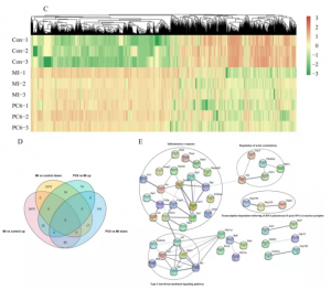 為了探討針刺治療心肌梗死的機(jī)制,作者利用納米孔完成了不同組的基因表達(dá)檢測(cè)。RNA-seq結(jié)果顯示,與對(duì)照組相比,MI組有5083個(gè)差異表達(dá)基因,PC6組與MI組相比有324個(gè)差異表達(dá)基因。通過(guò)聚類分析將對(duì)照組、MI組和PC6組中上調(diào)和下調(diào)基因制作熱圖和維恩圖,發(fā)現(xiàn)MI組2773個(gè)差異基因上調(diào),針刺治療下調(diào)了其中的65個(gè)差異基因,同時(shí),在MI組的2308個(gè)下調(diào)的差異基因中,針刺治療可逆轉(zhuǎn)19個(gè)差異基因的表達(dá)。作者推測(cè)這84個(gè)差異基因可能是針刺抗心肌缺血作用的關(guān)鍵靶點(diǎn)?;赟TRING數(shù)據(jù)庫(kù)對(duì)MI和PC6共同調(diào)控的差異基因進(jìn)行蛋白-蛋白相互作用(PPI)網(wǎng)絡(luò)分析。結(jié)果表明,蛋白質(zhì)主要富集了4類,主要包括:炎癥反應(yīng),肌動(dòng)蛋白細(xì)胞骨架的調(diào)節(jié),I型干擾素介導(dǎo)的信號(hào)通路,以及RNA聚合酶II基因DNA在核外周的轉(zhuǎn)錄依賴鏈。