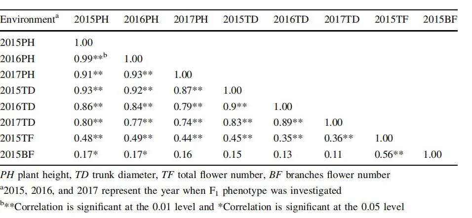 在2015-2017年,對F1群體的4個表型性狀進行了評估,其中,PH是通過用尺子測量從地面到樹冠頂部的方式來調(diào)查;TD是記錄移接處上方10cm的直徑;TF和BF是計算總花數(shù)和分支花數(shù)。此外,相關性分析顯示,PH和TD呈顯著正相關(r>0.74, p<0.01)。