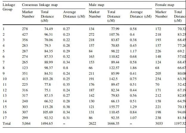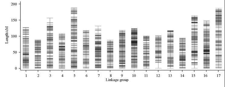 最后,利用HighMap將5113個高質(zhì)量SLAF標記用于遺傳圖譜構(gòu)建,其中,雌性圖譜包含2622個SLAF標記,總圖距1666.35cM。雄性圖譜包含3033個SLAF標記,總圖距為1197.52cM。中性圖譜包含5064個SLAF標記,形成17條連鎖群,總圖距為1494.65cM,平均圖距為0.36cM。在該圖譜中,有189個SLAF標記在11個連鎖群中存在偏分離,包含112個SLAF標記的LG7標記偏分離率*高。在LG1、LG2、LG3、LG6、LG12和LG16中均未出現(xiàn)偏分離現(xiàn)象。并對以上圖譜進行了單體來源評估、熱圖評估和共線性評估,結(jié)果表明該圖譜是高質(zhì)量的評估遺傳圖譜。