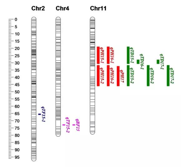 為了檢測F1群體中與4個性狀相關的位點,對其進行QTL分析。對于PH,結(jié)合3年的表型,在11號染色體上共鑒定到5個QTLs(qPH15-1, qPH16-1, qPH15-2, qPH16-2和qPH17),這些QTLs對表型變異的解釋范圍為17.20% ~ 22.40%。對于TD,共定位到6個QTLs(qTD15-1, qTD16-1, qTD17-1, qTD15-2, qTD16-2和qTD17-2),均位于11號染色體上,對表型變異解釋范圍為14.00~20.80%,PH與TD定位結(jié)果相重疊,均位于兩個QTL簇,該結(jié)果進一步證實了PH和TD在表型上呈顯著正相關。對TF,定位到2個QTLs(qTF15-1和qTF15-2),分別位于2和4號染色體上,解釋表型變異率分別為8.80%和9.20%;另外,還定位到1個BF相關的QTL qBF15,可以解釋34.80%的表型變異。qTF15-2和qBF15在4號染色體被定位到同一個染色體區(qū)間內(nèi)。