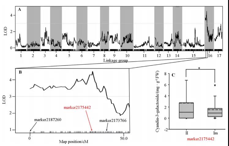 采用Kruskal-Wallis檢驗對矢車菊素半乳糖苷濃度進行QTL分析,采用區(qū)間作圖(IM)和多QTL模型(MQM)檢測潛在的QTL,閾值LOD為3.0。結(jié)果顯示,只在‘Red3’的LG16位點的頂端檢測到一個LOD值為4.49的QTL,該QTL的區(qū)間范圍為0 ~ 40.79 cM,解釋表型變異率為14.4%。此外,該QTL兩側(cè)有兩個標記,分別是marker2187260 ~ marker2173766,作者進一步調(diào)查了不同株型之間的表型差異,結(jié)果表明,最接近QTL峰的標記之一mark2175442將分離群體分為純合子ll型和雜合子lm型兩類。純合子ll型表現(xiàn)出明顯高于雜合子lm 型的矢車菊素半乳糖苷濃度。結(jié)合前人的研究,該研究結(jié)果表明,LG16頂部的QTL熱點區(qū)域可能在控制蘋果紅肉著色中發(fā)揮潛在的作用。