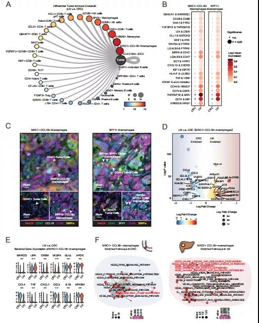 本研究進(jìn)行了基于配體-受體的癌癥-免疫串?dāng)_分析,并在原發(fā)部位和轉(zhuǎn)移部位之間進(jìn)行比較(圖 2A),發(fā)現(xiàn)SPP1+巨噬細(xì)胞和MRC1+ CCL18+巨噬細(xì)胞在LM和CRC之間的差異較大,這一結(jié)果表明肝轉(zhuǎn)移癌細(xì)胞可能優(yōu)先重編程巨噬細(xì)胞并誘導(dǎo)其特定的功能狀態(tài)(圖 2A)。值得注意的是,LM中的轉(zhuǎn)移性腫瘤細(xì)胞優(yōu)先表達(dá)配體CD47,這是一個(gè)重要的檢查點(diǎn),因此可能招募相應(yīng)的受體SIRPA或激活MRC1+ CCL18+巨噬細(xì)胞(圖 2B)。進(jìn)一步利用mIHC來(lái)可視化這些蛋白質(zhì),觀察CD47+腫瘤細(xì)胞和SIRPA+巨噬細(xì)胞之間的串?dāng)_(圖 2C)。這些配體-受體對(duì)為靶向治療肝轉(zhuǎn)移提供了線索。
