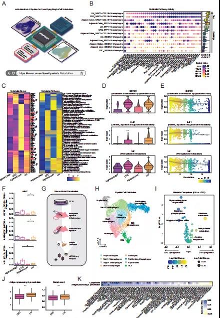 為了說(shuō)明代謝重編程與巨噬細(xì)胞表型變化的關(guān)聯(lián),本研究計(jì)算了巨噬細(xì)胞的經(jīng)典通路評(píng)分,例如抗原加工、呈遞、炎癥、血管生成、免疫抑制、吞噬作用、白細(xì)胞介素信號(hào)通路和補(bǔ)體評(píng)分(圖 3J)。在LM中,MRC1+ CCL18+巨噬細(xì)胞的抗原加工和呈遞以及補(bǔ)體活性評(píng)分顯著增加(圖 3J),SPP1+巨噬細(xì)胞也顯示出類似的趨勢(shì)。某些基因如HLA-A(MHC I類分子之一)在LM的MRC1+ CCL18+巨噬細(xì)胞中上調(diào)。進(jìn)一步分析了42種腫瘤高代謝途徑與MRC1+ CCL18+巨噬細(xì)胞通路評(píng)分之間的相關(guān)性,發(fā)現(xiàn)包括戊糖和葡萄糖醛酸互變?cè)趦?nèi)的幾種巨噬細(xì)胞特異性代謝途徑與LM中的抗原加工和呈遞有很強(qiáng)的相關(guān)性,但在CRC的相關(guān)性很弱(圖 3K)。這些數(shù)據(jù)表明不同的代謝功能在MRC1+ CCL18+巨噬細(xì)胞表型中的潛在作用。