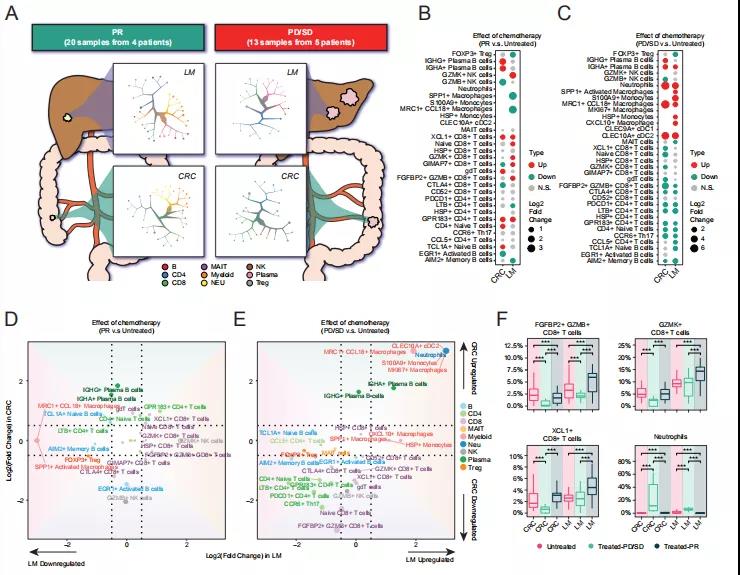 為探索NAC對(duì)腫瘤免疫的影響,本研究使用TooManyCells對(duì)所有CD45+細(xì)胞進(jìn)行聚類分析,發(fā)現(xiàn)CRC和LM之間細(xì)胞聚類的顯著差異(圖 4A)。NAC對(duì)TME的影響高度依賴于細(xì)胞類型(圖 4B和4C)。通常,在PR中,NAC可以下調(diào)免疫抑制細(xì)胞并激活細(xì)胞毒性細(xì)胞(圖 4B)。在LM中,響應(yīng)性NAC下調(diào)SPP1+巨噬細(xì)胞但上調(diào)細(xì)胞毒性T細(xì)胞,例如GZMK+CD8+ T細(xì)胞和XCL1+CD8+ T細(xì)胞(圖 4B和4D)。NAC-PR中僅剩下幾個(gè)MRC1+ CCL18+巨噬細(xì)胞和幾十個(gè)SPP1+巨噬細(xì)胞,表明NAC在抑制巨噬細(xì)胞中的潛在作用。然而,在PD/SD中,觀察到與PR不同的免疫細(xì)胞變化。例如,SPP1+巨噬細(xì)胞和MRC1+ CCL18+巨噬細(xì)胞在LM中增加,而細(xì)胞毒性免疫細(xì)胞(即FGFBP2+ GZMB+ CD8+ T細(xì)胞)下調(diào)(圖 4C、4E和4F)。這些結(jié)果可能與癌細(xì)胞的器官特異性和治療效果有關(guān)。例如,轉(zhuǎn)移性PD/SD癌細(xì)胞表現(xiàn)出DNA修復(fù)和脂肪酸代謝的特異性富集,而轉(zhuǎn)移性PR癌細(xì)胞與脂肪生成更相關(guān)。除腫瘤組織外,NAC上調(diào)鄰近正常肝臟中GZMB+CD8+ T細(xì)胞的比例,并增加PR患者PBMC中FGFBP2+GZMB+CD8+ T細(xì)胞的比例。對(duì)于PD/SD患者,在鄰近結(jié)腸和肝臟中也觀察到FGFBP2+ GZMB+CD8+ T細(xì)胞水平降低??傊?,有效的NAC不僅重新編程了腫瘤內(nèi)免疫平衡,還激活了全身抗腫瘤免疫反應(yīng),為支持NAC在可切除CRLM中的潛在作用提供了證據(jù)。