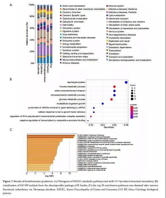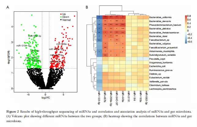 通過行Spearman相關(guān)分析。圖2B顯示了一個熱圖,描繪了五個與某些微生物區(qū)系具有統(tǒng)計顯著正相關(guān)和負相關(guān)的miRNA(P<0.05)。在這五種miRNA中,miR-122-5p在哺乳動物的進化過程中高度保守,與八種腸道細菌相關(guān),包括兩種腸道細菌B.uniformis和P.faecium,它們有顯著差異(分別為P=0.023和0.031)。