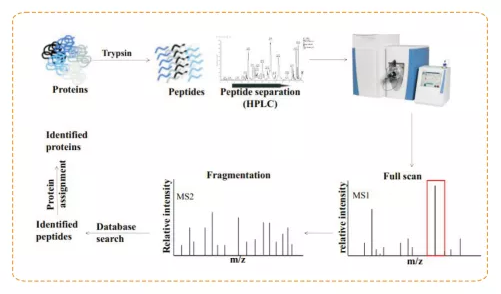 蛋白質(zhì)質(zhì)譜鑒定的基本原理是用蛋白酶將蛋白質(zhì)消化成肽段混合物,經(jīng)MAILDI或ESI等軟電離手段將其離子化,然后通過(guò)質(zhì)量分析器將具有特定質(zhì)核比的肽段離子分離開來(lái)。通過(guò)實(shí)際譜圖和理論上蛋白質(zhì)經(jīng)過(guò)蛋白酶消化后產(chǎn)生的一級(jí)質(zhì)譜峰圖和二級(jí)質(zhì)譜峰圖進(jìn)行的比對(duì),進(jìn)行蛋白鑒定。