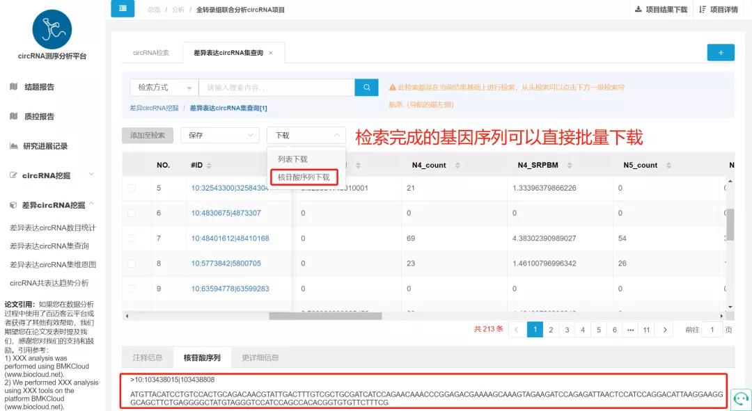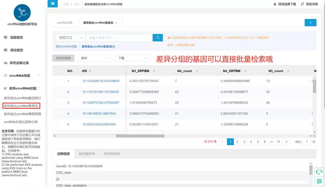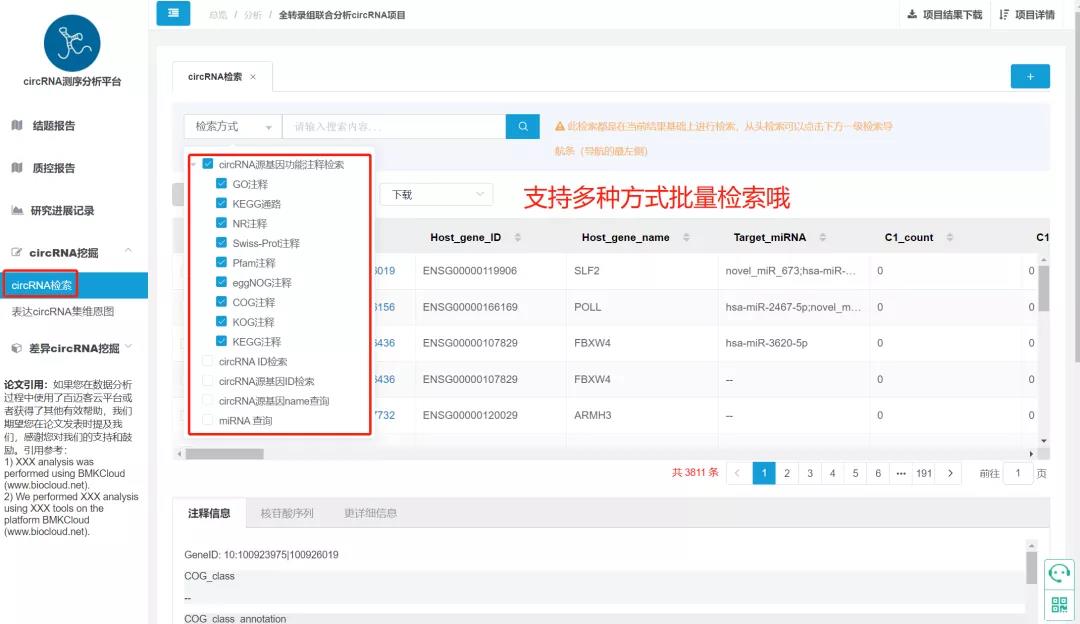 CircRNA的功能分析主要依靠于來源基因的功能注釋,如何在海量的數(shù)據(jù)中直接找到關(guān)心的目的基因呢?首先就是根據(jù)功能注釋進(jìn)行檢索,百邁客云平臺(tái)的CircRNA分析平臺(tái)中,支持針對(duì)結(jié)果根據(jù)八大功能數(shù)據(jù)庫的注釋信息批量檢索相關(guān)注釋基因、并且批量提取相關(guān)信息;靶向關(guān)系的預(yù)測(cè)也是關(guān)鍵circRNA檢索的必要一步,CircRNA分析平臺(tái)同時(shí)支持通過miRNA的ID批量提取相關(guān)靶向的CircRNA信息,此外,CircRNA ID、來源基因ID、來源基因name等功能,通過上傳ID文件均可實(shí)現(xiàn)批量查詢,甚至可以批量下載序列文件,省去多個(gè)文件來回切換的繁雜操作,一鍵式提取關(guān)鍵信息!