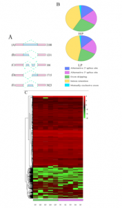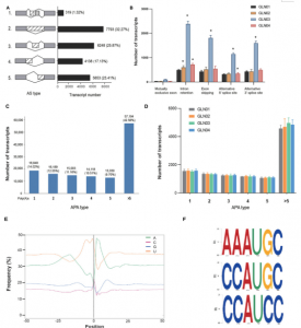 APA和AS的鑒定增強了我們對轉(zhuǎn)錄異構(gòu)體多樣性生物學(xué)作用的理解。在本研究中,確定了9035例AS事件,并將其分為五類(圖2)。在檢測到的全部轉(zhuǎn)錄本中,有6.86%由某種可變剪切形式產(chǎn)生,其中內(nèi)含子保留是最常見的可變剪切事件。此外,在88092個基因位點上進(jìn)一步確定了207955個APA事件。
