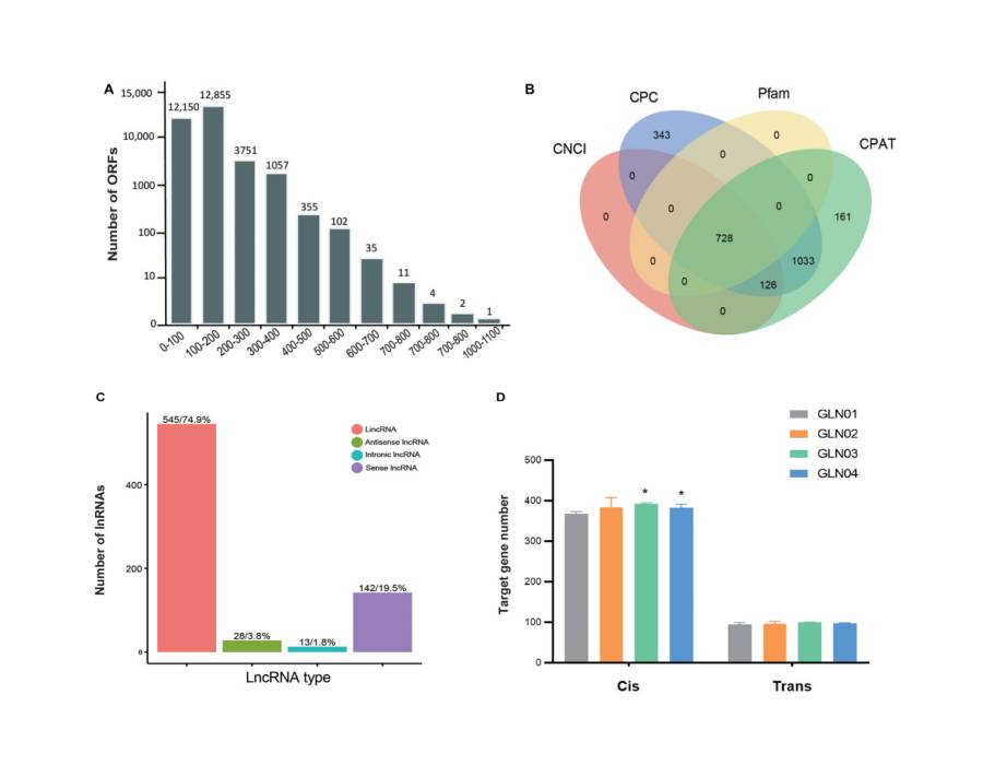 總共鑒定了38108個ORF,包括30323個(79.57%)完整的ORF,它們同時具有起始密碼子和終止密碼子。就完整的ORF而言,100-200 bp(12855個ORF)、0-100 bp(12150個)和200-300 bp(3751個)長度所占比例最大(圖3A)。共鑒定出728個lncRNAs,平均長度在298到4362 nt之間。這些lncRNAs進(jìn)一步分類為545個基因間區(qū)lncRNAs(74.86%)、28個反義lncRNAs(3.85%)、13個內(nèi)含子lncRNAs(1.79%)和142個正義lncRNAs(19.50%)(圖3C)。研究還發(fā)現(xiàn),這些lncRNAs調(diào)控的順式靶基因比那些反式靶基因多(圖3D)。發(fā)現(xiàn)在GLN01和GLN03之間(Student t檢驗,p=0.002),以及GLN01和GLN04之間(p=0.037),這些lncRNAs調(diào)控的順式靶基因顯著增加,而這些lncRNAs調(diào)控的反式靶基因在整個莖發(fā)育過程中未發(fā)現(xiàn)顯著變化。