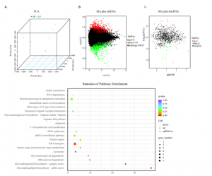 共鑒定出1390個mRNAs(671個上調(diào),719個下調(diào))和50個lncRNAs(22個上調(diào),28個下調(diào))(圖4B和C)。在本研究中,預(yù)測DE-lncRNAs與其靶mRNA協(xié)同發(fā)揮其功能,從而說明珊瑚對環(huán)境變化的適應(yīng)。對lncRNA靶向mRNAs進(jìn)行KEGG富集分析,以探索鹿角珊瑚lncRNAs的功能。根據(jù)KEGG分析,DE-lncRNA靶向mRNA在五條途徑中顯著富集(q值<0.05),如ko00603鞘糖脂生物合成-球狀系列、ko00531氨基糖降解、ko00604鞘糖脂生物合成-神經(jīng)節(jié)苷脂系列、ko00511其他聚糖降解、ko04142溶酶體、,ko00520氨基糖和核苷酸糖代謝,以及ko03013 RNA轉(zhuǎn)運。
