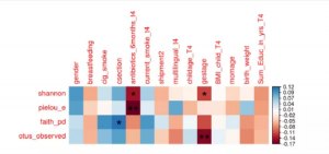阿爾法多樣性指標(biāo)與認(rèn)知水平之間存在顯著負(fù)相關(guān)。如表3所示,F(xiàn)aith系統(tǒng)發(fā)育多樣性指數(shù)與WPPSI-III FIQ之間的顯著關(guān)聯(lián)。同時(shí)發(fā)現(xiàn)抗生素的使用與Shannon多樣性指數(shù)和Pileou均勻度呈負(fù)相關(guān),妊娠期與Shannon多樣性指數(shù)和觀測(cè)到的物種數(shù)呈負(fù)相關(guān),以及C-section與Faith的系統(tǒng)發(fā)育多樣性指數(shù)呈現(xiàn)正相關(guān)(圖S1)。