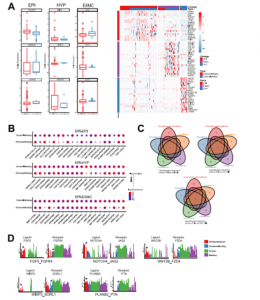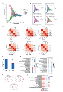 首先基于所有細(xì)胞的轉(zhuǎn)錄組學(xué)特性構(gòu)建了一個(gè)導(dǎo)向圖(SPRING),所有細(xì)胞分為三個(gè)分支:EPI、HYP和TE(圖 2A),明確了嵌合體和對(duì)照(人和食蟹猴)胚胎之間基因表達(dá)模式的相關(guān)性(圖 2B)。當(dāng)嵌合人類(lèi)細(xì)胞與對(duì)照人類(lèi)(0.460)或?qū)φ帐承泛铮?.459)細(xì)胞進(jìn)行比較時(shí),獲得了類(lèi)似的相關(guān)系數(shù)(圖 2B,右圖),但與對(duì)照胚胎相比,嵌合猴細(xì)胞的相關(guān)系數(shù)高于嵌合人類(lèi)細(xì)胞(圖 2B,左圖);接下來(lái)發(fā)現(xiàn)嵌合人EPI-like細(xì)胞與人胚胎中的EPI細(xì)胞相似,而嵌合人HYP和EXMC-like細(xì)胞分別與嵌合猴HYP和EXMCs細(xì)胞相關(guān)系數(shù)最高(圖 2C)。同時(shí)發(fā)現(xiàn)嵌合人類(lèi)EPI-like細(xì)胞逐漸傾向于嵌合猴EPI細(xì)胞,R2值從0.363(植入前EPI [Pre_EPI])增加到0.464(植入后EPI [PostL_EPI]),再增加到0.693(原腸[Gast]細(xì)胞)(圖 2C)。以上結(jié)果表明猴胚胎微環(huán)境對(duì)人類(lèi)細(xì)胞的基因轉(zhuǎn)錄狀態(tài)產(chǎn)生影響,反之亦然。