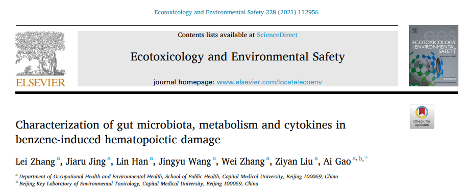 1.Zhang L, Jing J, Han L, et al. Characterization of gut microbiota, metabolism and cytokines in benzene-induced hematopoietic damage[J]. Ecotoxicology and Environmental Safety, 2021, 228: 112956.