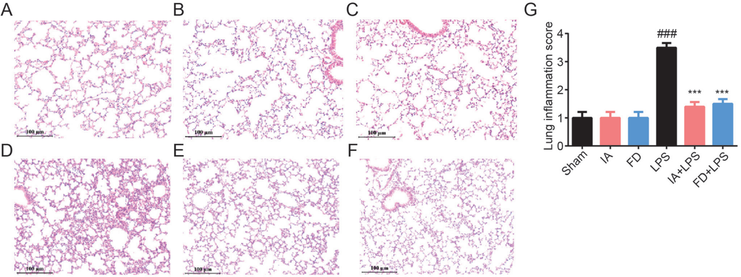 特定無(wú)菌C57BL/L的成年小鼠,隨機(jī)分為6組:①Sham(注射磷酸緩沖鹽水,自由喝水),②FD(注射磷酸緩沖鹽水,自由喝康普茶),③IA(注射磷酸緩沖鹽水,康普茶灌胃100 μL/100g,每天),④LPS(注射LPS誘導(dǎo)膿毒癥,自由喝水),⑤FD+LPS(注射LPS誘導(dǎo)膿毒癥,自由喝康普茶),⑥IA+LPS(注射LPS誘導(dǎo)膿毒癥,康普茶灌胃100 μL/100g,每天)。