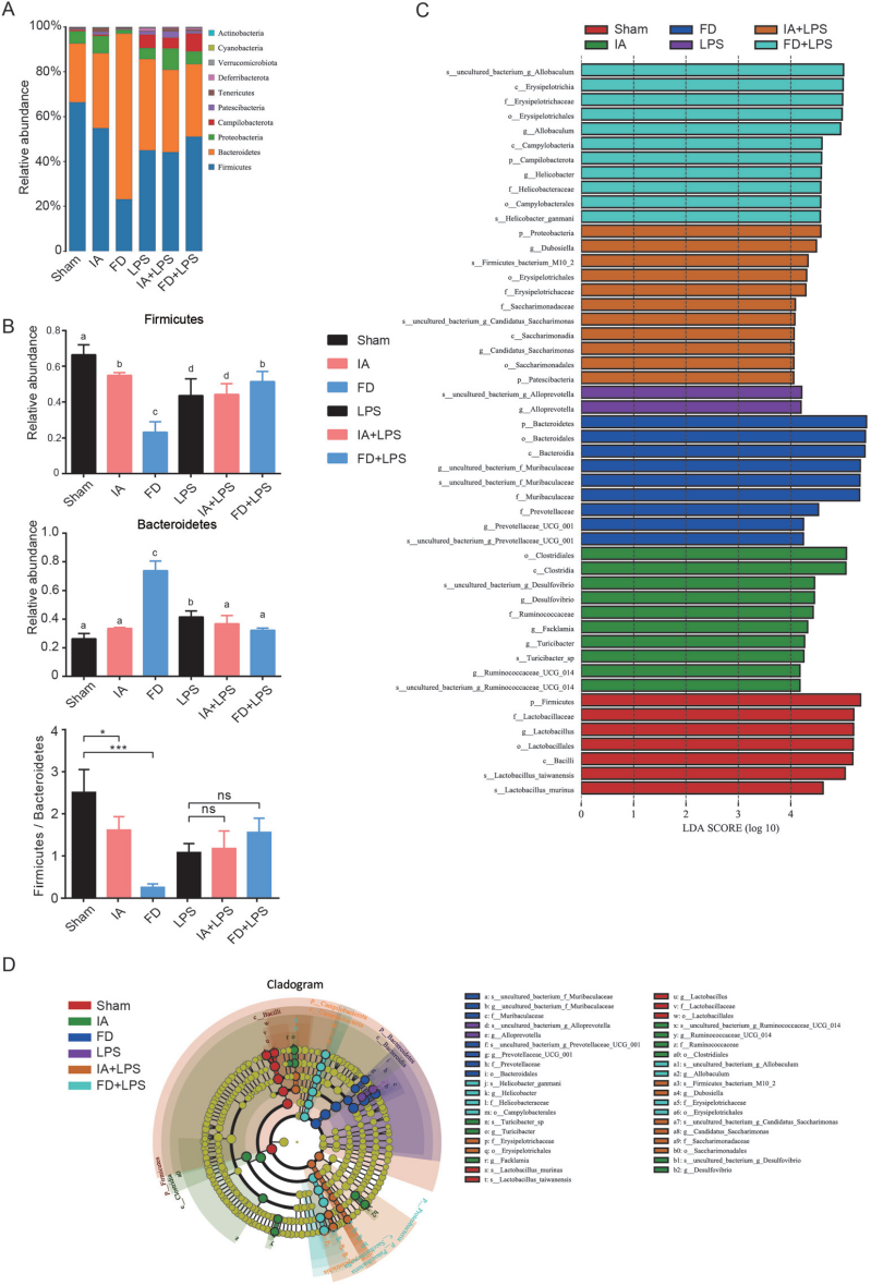 康普茶攝入對(duì)小鼠腸道微生物門(mén)水平分布產(chǎn)生了影響,不同組小鼠的腸道微生物群不同:在Sham組,乳酸桿菌屬為生物標(biāo)志物;在IA組中,彎曲桿菌屬、法克蘭菌屬、瘤胃球菌科和脫硫弧菌屬是生物標(biāo)志物;在FD組中,普雷沃氏菌科屬和未培養(yǎng)的細(xì)菌屬為生物標(biāo)志物。異種桿菌屬是LPS組的生物標(biāo)志物,F(xiàn)D+LPS組是幽門(mén)螺桿菌、白桿菌和真桿菌,杜博西菌和念糖菌是IA+LPS組的生物標(biāo)志物。