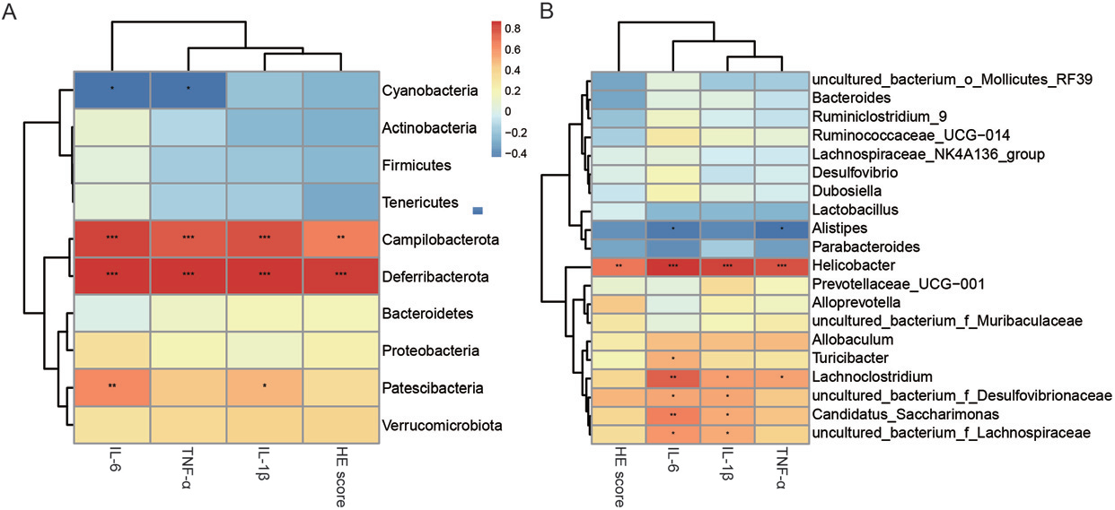 計(jì)算6組間差異,評(píng)價(jià)IL-1β、IL-6、TNF-α和HE評(píng)分對(duì)微生物群組合的影響。去鐵桿菌門(mén)與IL-6、IL-1β、TNF-α和HE評(píng)分呈正相關(guān),相關(guān)系數(shù)分別為0.852(p<0.001)、0<0.852(p<0.001)、0.843(p<0.001)和0.852(p<0.001)。藍(lán)細(xì)菌門(mén)的豐度與IL-6(r=0.523,p<0.05)和TNF-α(r=0.520,p<0.05)呈負(fù)相關(guān)。在屬水平上,幽門(mén)螺桿菌與IL-6、IL-1β、TNF-α和HE評(píng)分呈正相關(guān),相關(guān)系數(shù)分別為0.816(p<0.001)、0.776(p<0.001)、0.749(p<0.001)和0.635(p<0.01)。12B)。蛛網(wǎng)膜梭狀芽孢桿菌與IL-1β、IL-6和TNF-α也呈正相關(guān),相關(guān)系數(shù)分別為0.700(p<0.01)、0.515(p<0.05)和0.509(p<0.05)。而腐爛別樣桿菌與IL-6和TNF-α呈負(fù)相關(guān),相關(guān)系數(shù)分別為0.482(p<0.05)和0.517(p<0.05)。