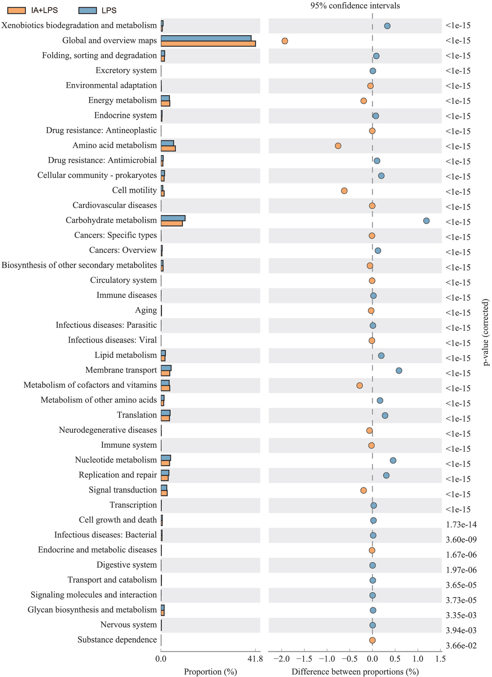 預(yù)測(cè)IA和IA+LPS組的功能基因,1343條顯著差異通路,其中“全局和概述”、“碳水化合物代謝”、“氨基酸代謝”、“能量代謝”、“輔助因子和維生素代謝”、“膜運(yùn)輸”、“核苷酸代謝”、“翻譯”、“復(fù)制修復(fù)”、“信號(hào)轉(zhuǎn)導(dǎo)”的平均比例高,且都是顯著代謝途徑(p<0.05)。