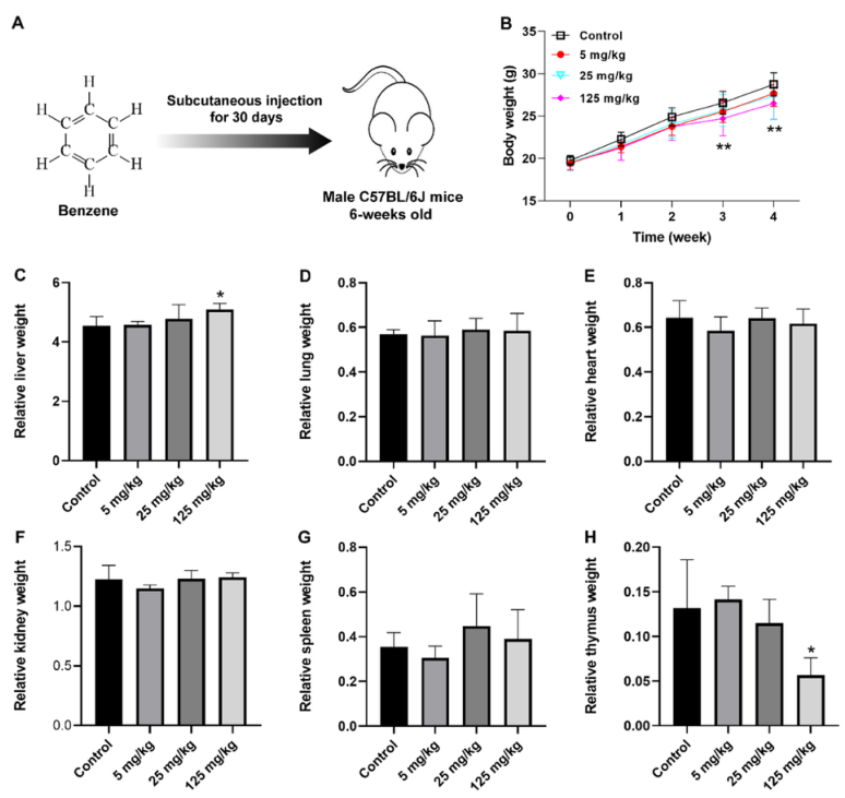 圖1. 暴露30天后苯對(duì)小鼠的總體毒性(每組n=6)。