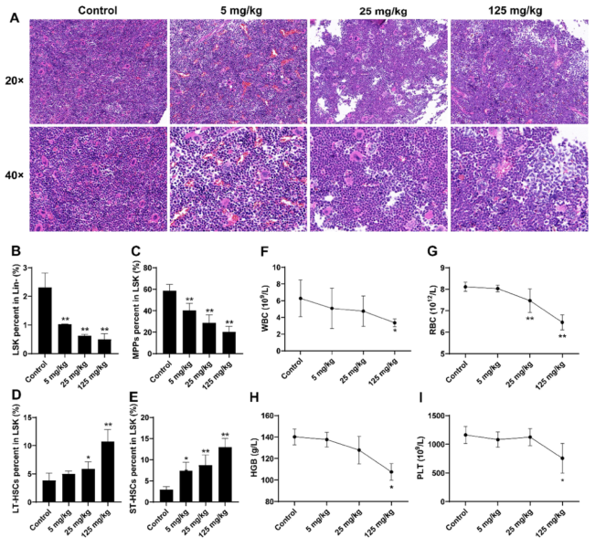 骨髓是苯暴露的主要靶器官,含有大量的造血干細(xì)胞。所有成熟的血細(xì)胞通常來(lái)源于造血干細(xì)胞( HSCs)。暴露于苯的小鼠股骨切片的H&E染色顯示出造血損傷的跡象。苯暴露小鼠骨髓中有核細(xì)胞密度明顯降低,主要表現(xiàn)為髓系造血細(xì)胞(WBC、RBC、巨核細(xì)胞和粒細(xì)胞)減少,細(xì)胞間隙增大,脂肪滴積聚,細(xì)胞腫脹。這些病理改變?cè)?25mg /kg苯組小鼠中更明顯,而在對(duì)照組中則不明顯(圖2A)。為進(jìn)一步研究苯暴露對(duì)造血細(xì)胞生長(zhǎng)和自我更新的影響,采用流式細(xì)胞術(shù)定量檢測(cè)造血干細(xì)胞LSK、多能祖細(xì)胞(MPPs)、長(zhǎng)期造血干細(xì)胞(LT-HSCs)和短期造血干細(xì)胞(ST- HSCs)。這一結(jié)果表明,與對(duì)照組小鼠相比,接觸苯后LSK和MPPs降低,而 LT-HSCs和ST- HSCs增加(圖2B-E)。苯中毒是惡性腫瘤發(fā)生前的一種表現(xiàn),其特征是全血細(xì)胞計(jì)數(shù)顯著減少。該研究中,125 mg /kg苯組WBC、RBC、HGB和PLT水平顯著降低(P<0.05)(圖2F-I)。綜上所述,LSK比5 mg/kg和25 mg/kg苯暴露組的血液學(xué)變化更敏感,表明LSK可能是對(duì)造血損傷反應(yīng)的敏感指標(biāo)。125 mg/kg苯暴露后,血液系統(tǒng)發(fā)生明顯變化,并形成苯毒性模型。