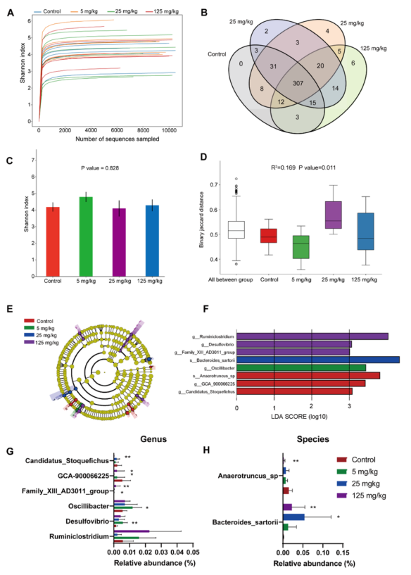 采集的新鮮盲腸內(nèi)容物進(jìn)行16S rRNA基因測(cè)序分析,結(jié)果表明,各組的Shannon曲線趨于飽和,表明測(cè)序數(shù)據(jù)的數(shù)量和深度足以反映大部分微生物信息(圖3A)。在Venn圖中顯示了四組中共有和特有的OTUs(圖3B)。在本研究中,433個(gè)OTU中有307個(gè)是所有組共有的。接觸苯組和對(duì)照組之間的alpha多樣性并沒(méi)有導(dǎo)致微生物群落的差異(圖3C)。值得注意的是,beta多樣性結(jié)果顯示,暴露苯組和對(duì)照組的植物區(qū)系組成和分布有顯著差異(圖3D)。通過(guò)LEfSe分析,在暴露于苯的小鼠和對(duì)照小鼠盲腸內(nèi)容物中共鑒定出8個(gè)腸道微生物群,這些差異微生物群的相對(duì)豐度主要反映在屬和種水平上的變化(圖3E-F)。在屬水平,與對(duì)照相比,125 mg/kg苯暴露組中Ruminiclostridium, Desulfovibrio 和 Family_-XIII_AD3011_group,5 mg/kg苯暴露組的Oscil-libacter相對(duì)豐度顯著提高;而GCA-900066225和Candidatus_stoquefichus的豐度則顯著降低(圖4G)。在種水平,25 mg/kg苯暴露組Bacteroides_sartorii的豐度高于對(duì)照組,Anaerotruncus_sp的豐度呈相反的趨勢(shì)(圖4H)。