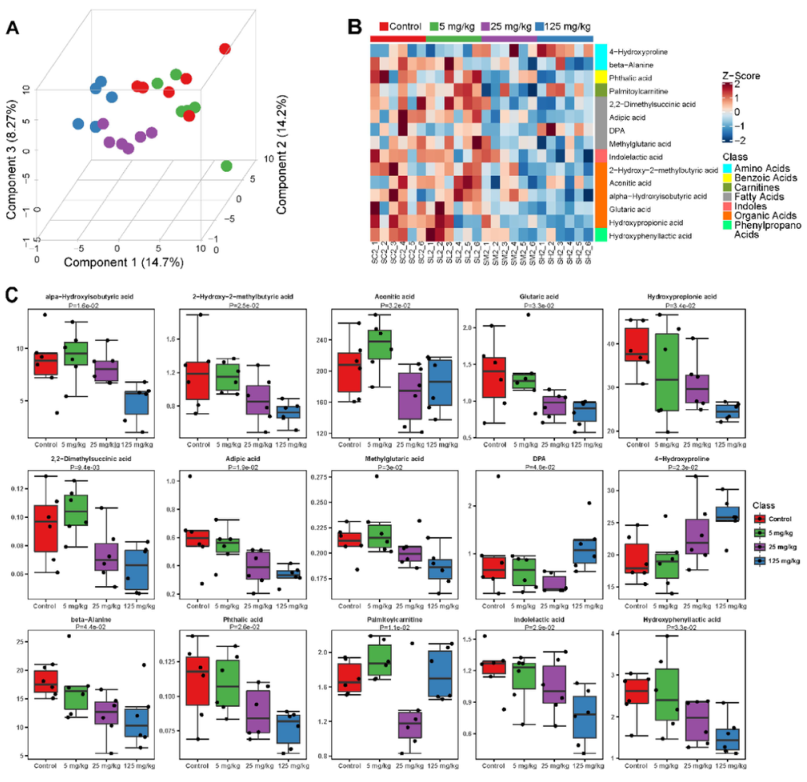 使用絕對(duì)定量代謝組學(xué)研究了苯暴露30天后血漿代謝物的差異變化。如圖4A所示,成功建立了PLS-DA模型,相似樣本聚集顯著。同時(shí),分別用PLS-DA和Mann-Whitney U檢驗(yàn)計(jì)算VIP值和P值。采用UPLC-MS/MS共鑒定了209種血漿代謝物,15種不同代謝物。在VIP>1和P<0.05閾值下,苯暴露小鼠與對(duì)照組之間的潛在生物標(biāo)記物為羥基苯基乳酸),這些代謝物主要來(lái)自有機(jī)酸、脂肪酸、氨基酸、苯甲酸、肉堿、吲哚和苯丙酸(圖4B和表S2)。15種不同代謝物的劑量效應(yīng)關(guān)系如圖4C所示。