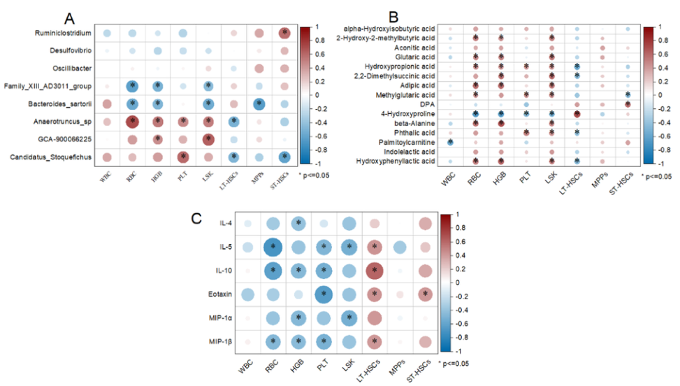 圖5.腸道微生物群、代謝產(chǎn)物和細(xì)胞因子與造血損傷的相關(guān)性。