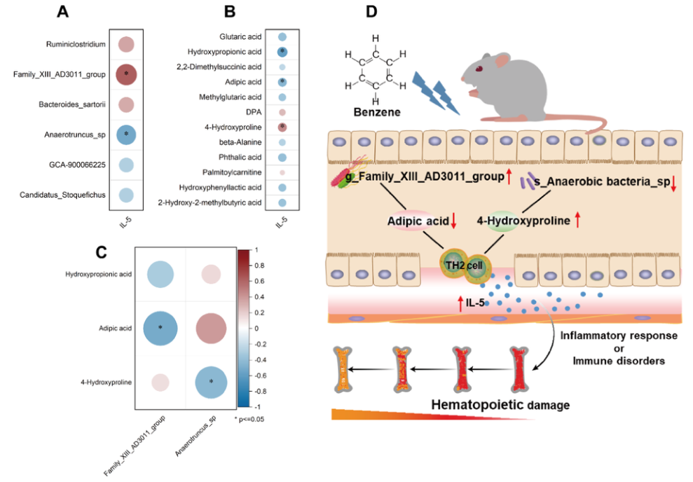 前人文獻(xiàn)表明TH2細(xì)胞分泌和產(chǎn)生了上調(diào)的細(xì)胞因子(如IL-4、IL-5和IL-10),并在機(jī)體中發(fā)揮重要的免疫作用。IL-5在苯暴露組和對(duì)照組表現(xiàn)出顯著的劑量-反應(yīng)關(guān)系,與造血損傷呈極顯著負(fù)相關(guān)。分析表明與IL-5與Family_XIII_AD3011_group呈顯著負(fù)相關(guān),與Anaerotruncus_sp呈正相關(guān)(圖6A)。此外,羥丙酸和己二酸與IL-5呈負(fù)相關(guān),而4-羥脯氨酸與IL-5呈正相關(guān)(圖6B),F(xiàn)amily_XIII_AD3011_group和Anaerotruncus_sp的豐度變化分別與己二酸和4-羥脯氨酸呈顯著負(fù)相關(guān)。綜上所述,F(xiàn)amily_XIII_AD3011_group和Anaerotruncus_sp可能調(diào)節(jié)了已二酸和4-羥脯氨酸的產(chǎn)生水平,這些代謝產(chǎn)物進(jìn)一步激活TH2細(xì)胞大量分泌IL-5,引起促炎反應(yīng)或免疫紊亂(圖6D)。這可能是苯誘導(dǎo)造血毒性的初步潛在機(jī)制,有待進(jìn)一步研究證實(shí)。