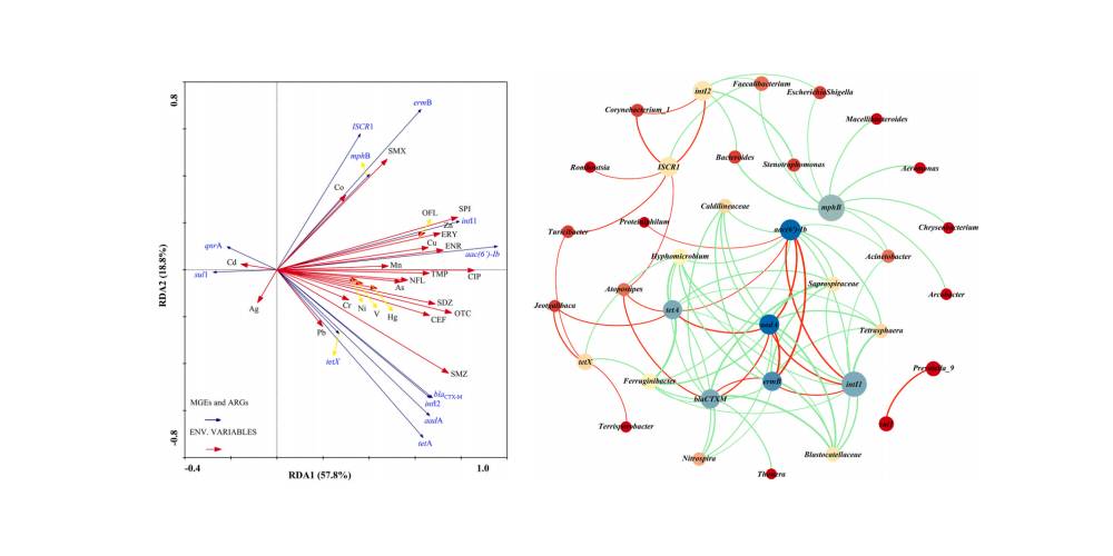 抗生素耐藥性是影響生態(tài)系統(tǒng)健康和公共衛(wèi)生的一個日益嚴(yán)重的問題。該研究在中國新鄉(xiāng)16個采樣點調(diào)查了9個耐藥基因(ARGs)和3個移動遺傳元件(MGEs)及其與抗生素、重金屬和微生物群的關(guān)系。醫(yī)院排出物中氟喹諾酮類(fluoroquinolones)含量最高,動物糞便中土霉素(oxytetracycline)含量最高。動物糞便中鋅和銅含量最高,可能影響intI1和aac(6’)-Ib基因的擴散。氨基糖苷類和磺胺類耐藥基因(aac(6 ‘)-Ib、aadA和sul1)是該地區(qū)主要ARGs。此外,除sul1基因外,動物糞便中ARGs和MGEs的檢出量均高于醫(yī)院污水。另一方面,污水處理廠(MWWTPs)中抗生素(29.76-100%)、重金屬(31.25-100%)和ARGs(1-3個數(shù)量級)的不完全去除導(dǎo)致這些污染物在下游河流中積累。網(wǎng)絡(luò)分析表明,ARG的潛在宿主(Jeotgalibaca、Atopostipes、Corynebacterium_1等)在動物糞便中比在醫(yī)院污水中更占優(yōu)勢,表明與醫(yī)院污水相比,ARG在動物糞便中的轉(zhuǎn)移潛力更高。這些結(jié)果為抗生素、重金屬、ARGs和微生物從人類和動物源通過MWWTP排放和施肥向接收環(huán)境的不同遷移和傳播途徑提供了有用的見解。