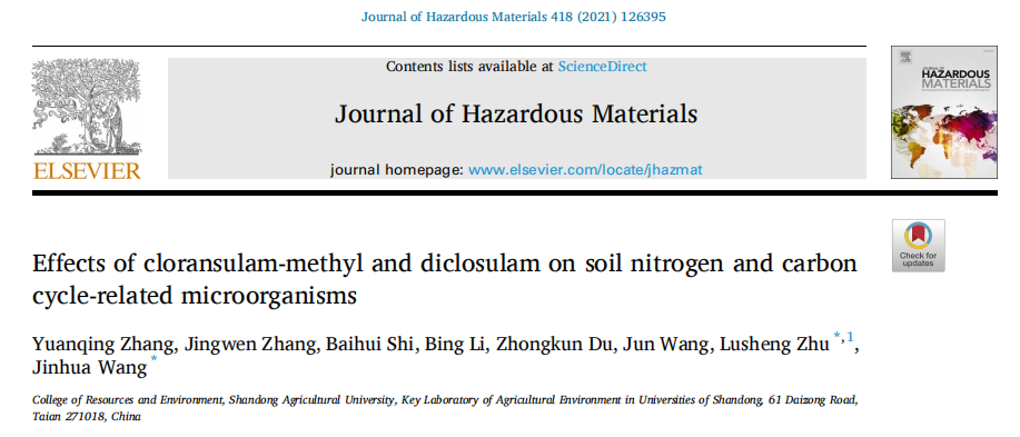 1.Zhang Y, Zhang J, Shi B, et al. Effects of cloransulam-methyl and diclosulam on soil nitrogen and carbon cycle-related microorganisms[J]. Journal of Hazardous Materials, 2021: 126395.