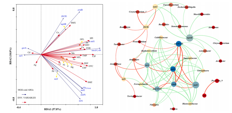 圖2.RDA分析和網(wǎng)絡(luò)圖分析