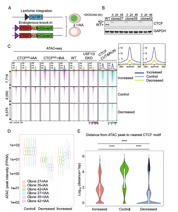 前期研究已經(jīng)通過將雙等位基因miniAID-mClover3標(biāo)簽導(dǎo)入人的內(nèi)源性CTCF位點(diǎn),并產(chǎn)生了三個(gè)CTCFAID細(xì)胞的克隆。在強(qiáng)力霉素和生長(zhǎng)素(IAA)處理下,強(qiáng)制表達(dá)與Skp1/Culin/F-box (SCF)泛素連接酶組分連接的OsTIR1,快速降解CTCF融合蛋白(圖1A)。當(dāng)強(qiáng)力霉素和IAA完全從培養(yǎng)基中洗脫后,這種降解是可逆的。通過對(duì)三個(gè)單細(xì)胞來源的克隆進(jìn)行IAA處理24小時(shí)的免疫印跡實(shí)驗(yàn),證實(shí)了CTCF能夠有效降解(圖1B),類似于之前在48h處理?xiàng)l件下的研究結(jié)果。