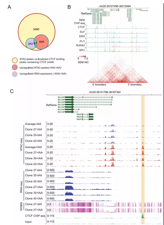 本文通過綜合分析建立了一個(gè)框架來識(shí)別假定的CTCF介導(dǎo)的絕緣子元件。將ATAC-seq結(jié)果中的3490個(gè)峰和有CTCF結(jié)合的峰取交集,共有716個(gè)增強(qiáng)的ATAC-seq峰。接下來,將它們與RNA-seq結(jié)果中上調(diào)的基因進(jìn)行比對(duì),判斷TSSs是否位于距離DARs區(qū)域2-50 kb的范圍。綜上所述,有67個(gè)基因符合這些標(biāo)準(zhǔn)(圖(Fig 4A)。這67個(gè)基因中有20個(gè)基因的附近有染色質(zhì)loop環(huán)。例如,在BLCAP基因上游約7 kb處觀察到一個(gè)假定的抑制性CTCF結(jié)合峰,該峰位于Hi-C數(shù)據(jù)所示的染色質(zhì)絕緣loop環(huán)中(圖4B )。在未經(jīng)過IAA處理的對(duì)照CTCFAID細(xì)胞中,CTCF與該motif結(jié)合導(dǎo)致染色質(zhì)可及性受到抑制,這在ATAC-seq數(shù)據(jù)中信號(hào)的缺失很明顯。然而,在急性CTCF耗竭時(shí),ATAC-seq峰值信號(hào)和BLCAP mRNA表達(dá)明顯增加(圖4C)。