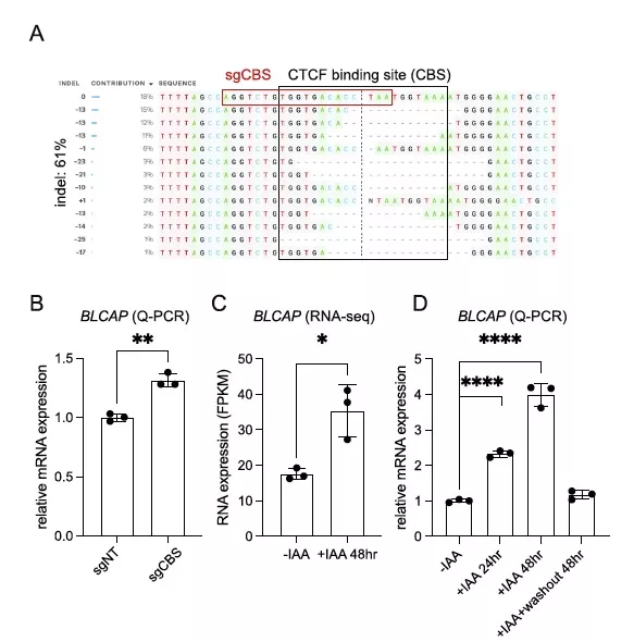 為了進(jìn)一步驗(yàn)證預(yù)測(cè)的假定絕緣子的作用,將慢病毒表達(dá)的引導(dǎo)RNA感染表達(dá)Cas9的SEM細(xì)胞中,然后進(jìn)行抗生素選擇。Sanger基因組測(cè)序(Inference of CRISPR edit, ICE)在目標(biāo)人群中檢測(cè)到約61%的總indel頻率(圖5A),與非靶向?qū)驅(qū)φ战M(sgNT)相比,導(dǎo)致BLCAP mRNA表達(dá)顯著增加(圖5B)。用IAA處理CTCFAID細(xì)胞24和48小時(shí),然后洗脫IAA進(jìn)行CTCF修復(fù)。通過RNA-seq分析和Q-PCR驗(yàn)證,驗(yàn)證急性CTCF蛋白耗竭時(shí)BLCAP mRNA的表達(dá)(圖5C)。不出所料,生長(zhǎng)素處理24或48 h后CTCF蛋白急性耗竭,BLCAP表達(dá)水平顯著升高。更重要的是,洗脫生長(zhǎng)素后,其表達(dá)水平恢復(fù)到親本細(xì)胞的水平(圖5D)。綜上所述,這些數(shù)據(jù)有力地支持了CTCF在BLCAP調(diào)控區(qū)域的占用充當(dāng)了控制BLCAP表達(dá)的功能絕緣體。