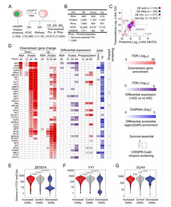 本文開發(fā)了一種多組學(xué)聯(lián)合的方法來定義CTCF共調(diào)控轉(zhuǎn)錄因子,總共鑒定了40個(gè)CTCF共同調(diào)控因子,這些TF在急性CTCF耗竭時(shí)在mRNA和/或蛋白質(zhì)水平上顯著影響其下游靶基因的表達(dá)(圖6D)。正如預(yù)期的那樣,這40個(gè)CTCF共調(diào)控因子中的大多數(shù)也在CTCF介導(dǎo)的DARs中有共同定位,證實(shí)了它們與CTCF有著潛在的直接共同調(diào)控作用。