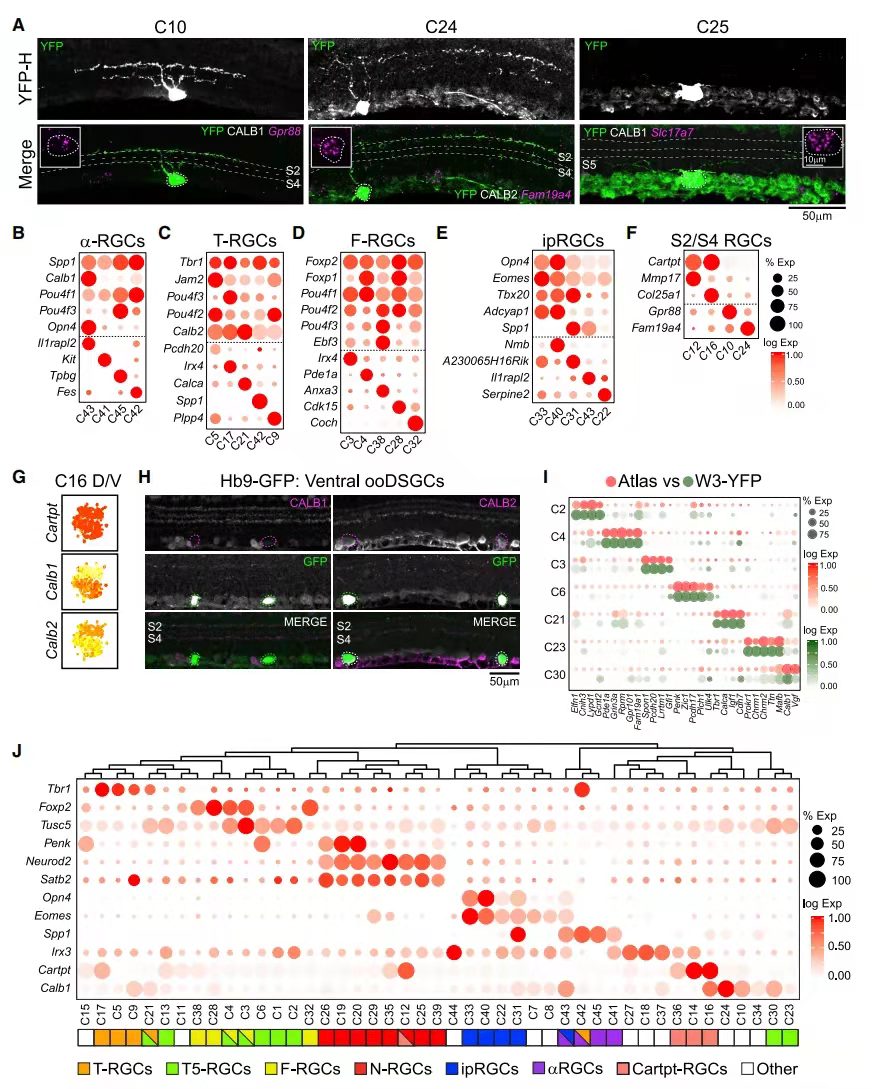 通過scRNA-seq和形態(tài)學(xué)對視網(wǎng)膜進(jìn)行雙重驗(yàn)證。結(jié)果發(fā)現(xiàn)aRGC為C41-43、45這4個(gè)cluster(圖 2B);之前的研究僅確定了4個(gè)T-RGC和4個(gè)F-RGC類型,但單細(xì)胞揭示了每個(gè)亞類中的第5種類型(分別為C9和C32;圖 2C和2D);同時(shí)ipRGC也發(fā)現(xiàn)了M1(C33和40)、M2(C31)和 M4(C43)類型的標(biāo)記(圖 2E);ooDSGC中大部分是Cartpt+,通過Mmp17的表達(dá)確定了N-ooDSGC;C16表達(dá)的Col25a1,是D-和V-ooDSGC的marker。最后CALB1+細(xì)胞是D-ooDSGCs ,CALB2高表達(dá)細(xì)胞是V-ooDSGC(圖 2F-2H)。已知RGC子類與cluster存在部分重合,每種cluster不超過兩個(gè)子類。子類與cluster重合表達(dá)的基因如圖2J,如:4/5 T-RGCs (Tbr1+)、4/5 F-RGCs (Foxp2+)、5/9 T5-RGCs (Tusc5+)、4/5 ipRGCs(Opn4+)和3/4 aRGC(Spp1+)。另外還鑒定到了新的子類:如8個(gè)表達(dá)轉(zhuǎn)錄因子Neurod2和Satb2的cluster被化為N-RGC等。其余11/45類型未分配到子類,但它們確實(shí)表現(xiàn)出與其他類型的相關(guān)性。