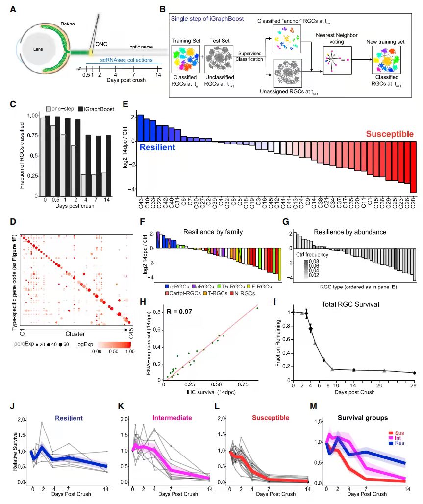 以RGC圖譜為基礎(chǔ),評估了不同細(xì)胞類型對ONC的彈性(圖 3A)。在ONC后14天對~8,500個(gè)RGC進(jìn)行分析,此時(shí)~80% RGC已經(jīng)死亡(圖 3C),該研究使用iGraphBoost對細(xì)胞進(jìn)行分群(圖 3B),iGraphBoost可以將89%損傷的RGC分配到各個(gè)cluster中(圖 3C)。損傷后第14天所有cluster表達(dá)的marker基因同1F(圖3D)。與對照相比,將14dpc不同RGC類型的存活率按從高到低排列(圖 3E),不同RGC類型在14dpc時(shí)表現(xiàn)出不同的存活率,范圍從1%到98%不等。比較轉(zhuǎn)錄組測序和IHC對細(xì)胞活率的結(jié)果,結(jié)果高度一致(Pearson r = 0.97)(圖 3H)。這些數(shù)據(jù)表明不同RGC對傷害的不同反應(yīng)。所有ipRGC(Opn4+)都是有彈性的,所有N-RGC類型都是易受影響的(圖 3F)。之前被定性為彈性子類的aRGC中,C42,43具有很高的彈性,但C41,45相對容易受到影響(圖 3F)。同樣,稀有和豐富的類型都可能具有彈性或脆弱性(圖 3G)。因此,基因表達(dá)或RGC子類都不是判斷細(xì)胞是否是彈性的完美因子。