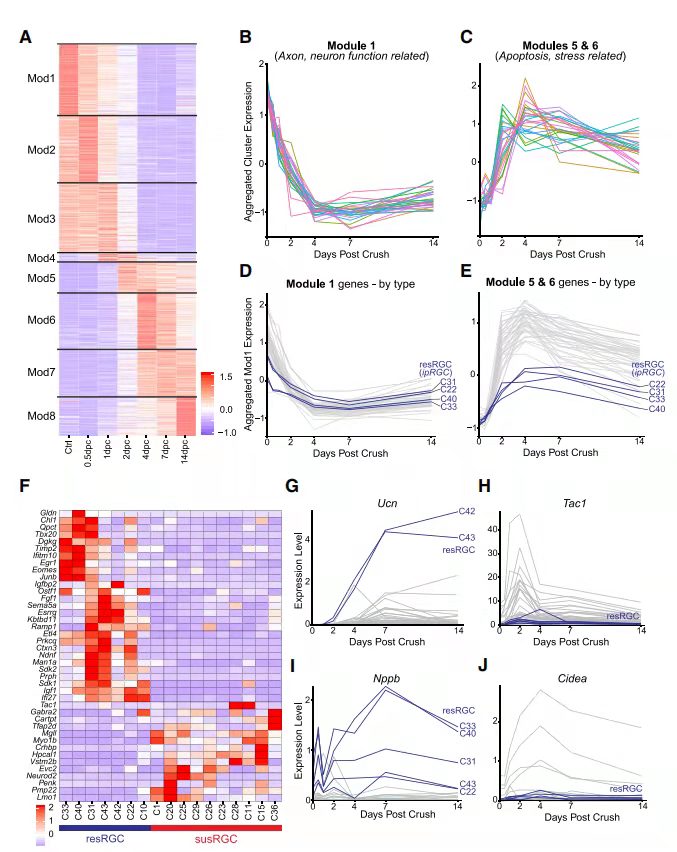 為了研究RGC中激活損傷反應(yīng),對ONC后的RGC進(jìn)行基因表達(dá)譜分析,確定了771個(gè)在不同類型之間的DE基因,通過k均值聚類(圖 4A)劃分為8個(gè)模塊(Mod1-8),識別具有不同時(shí)間動(dòng)態(tài)的基因集,這些基因集富集在不同的GO功能中,例如在0.5dpc開始下降的模塊1(Mod1)中的基因富集在健康神經(jīng)元相關(guān)的GO功能中,如動(dòng)作電位、突觸囊泡胞外/內(nèi)吞作用和逆行軸突運(yùn)輸(圖 4B)。相比之下,在Mod5和Mod6中的基因與細(xì)胞凋亡和應(yīng)激途徑相關(guān)(圖 4C)。DE基因幾乎沒有表現(xiàn)出強(qiáng)烈的類型特異性差異,但ipRGC類型除外,Mod5、6和7中C22、C31、C33和C40中的基因的上調(diào)明顯低于其他類型(圖 4D和4E)。