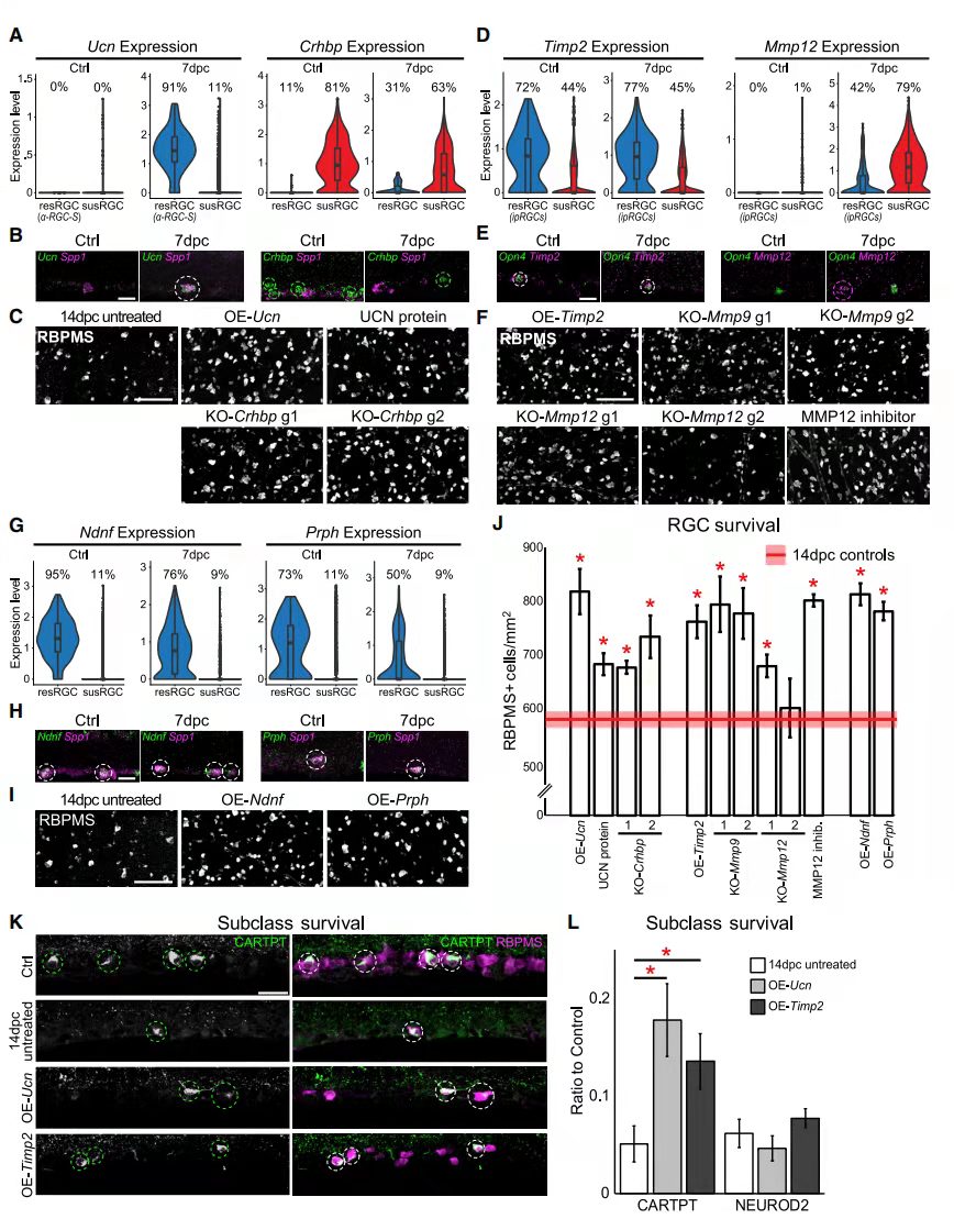 尿皮質(zhì)素(Ucn),它編碼來自促腎上腺皮質(zhì)激素釋放因子家族的肽;促腎上腺皮質(zhì)激素釋放激素結(jié)合蛋白(Crhbp)。ONC后Ucn僅在aRGC中上調(diào),而Crhbp在ONC前后susRGC中表達(dá)(圖 5A和5B)。過表達(dá)Ucn,注射Ucn重組蛋白,通過CRISPR和兩種不同的sgRNA敲除Crhbp,結(jié)果發(fā)現(xiàn)四種方式都顯著增加RGC的存活率(圖 5C和5J)。隨后又驗(yàn)證了幾對基因的表達(dá)和功能富集情況,結(jié)果與Ucn和Crhbp類似。說明可以通過對基因的干預(yù)來保護(hù)部分脆弱的RGC類型。
