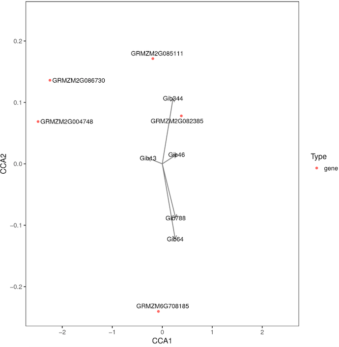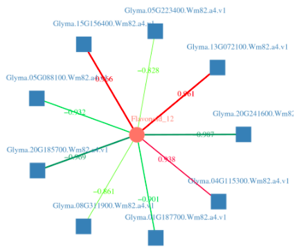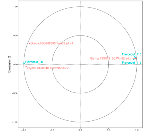 典型相關分析(canonical correlation analysis, CCA),是利用綜合變量對之間的相關關系來反映兩組指標之間的整體相關性的多元統(tǒng)計分析方法。對相關性網(wǎng)絡圖中的差異基因及差異代謝物進行典型相關分析,圖中以十字區(qū)分出四個區(qū)域,在同一個區(qū)域內,距原點越遠關聯(lián)性越高,在同一個象限內距離較近的代謝物和基因之間相關聯(lián)的程度高,基于此結果可進一步挖掘和代謝物最相關的基因。