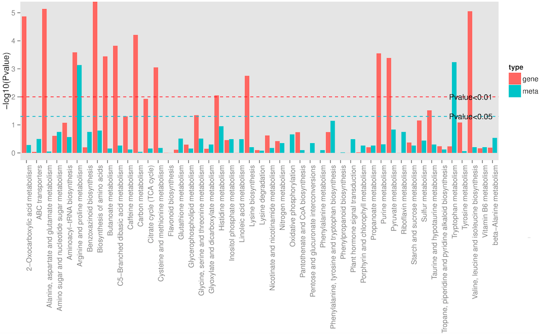 轉錄組測序可以得到大量差異基因、眾多調控網(wǎng)絡。難以確定關鍵途徑,也無法鑒定控制關鍵途徑的結構,而代謝物是生命活動最終的體現(xiàn)者,表型性狀的微小變化在代謝水平會呈指數(shù)放大,可以利用代謝組來反映表型的狀態(tài)變化,但是單獨代謝組檢測,無法解釋影響表型的基因機理。轉錄本水平的基因變化是否真的是決定表型變化的關鍵基因?這個問題需要通過轉錄組和代謝組的聯(lián)合分析進行回答。