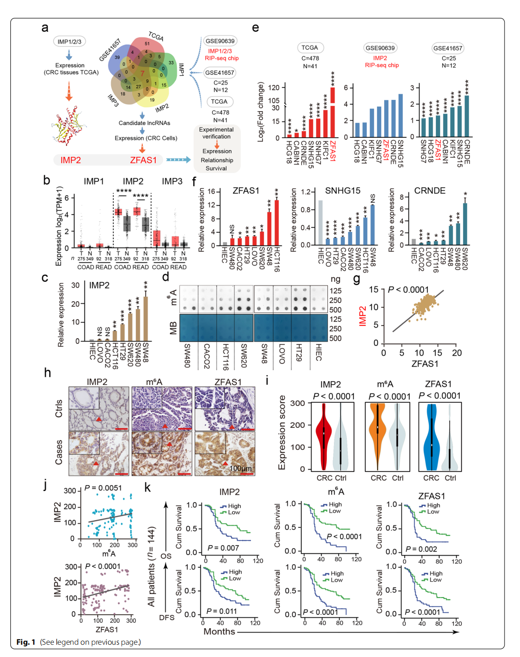 為了進(jìn)一步探討這些指標(biāo)在隊(duì)列中作為獨(dú)立預(yù)后因素的臨床效用,對(duì)144例CRC組織和癌旁組織進(jìn)行了秩和檢驗(yàn)和多變量cox回歸分析,發(fā)現(xiàn)IMP2表達(dá)量的升高顯著縮短了總生存期(OS)和無(wú)病生存期(DFS),m6A甲基化的高表達(dá)與不良的OS和DFA顯著相關(guān),而ZFAS1表達(dá)量高的CRC患者的OS急劇下降。DFS也明顯下降(圖1k)。說(shuō)明IMP2、m6A和ZFAS1的表達(dá)與CRC患者的生存狀況有著明顯的相關(guān)性。