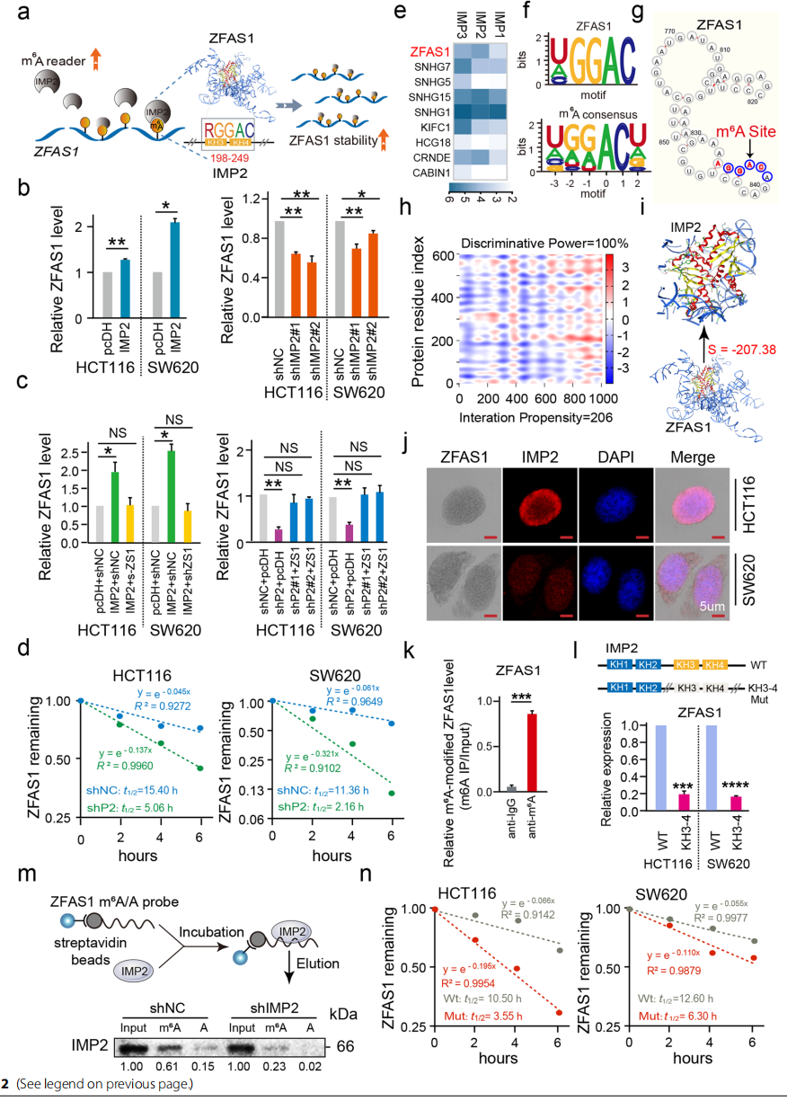 為了驗(yàn)證IMP2和ZFAS1之間的直接關(guān)聯(lián),初步分析了FLAG標(biāo)記的IMP1/2/3的RIP-seq數(shù)據(jù),發(fā)現(xiàn)和對(duì)照相比,異位IMP2的表達(dá)極大地豐富了HEK293T細(xì)胞的內(nèi)源性ZFAS1(圖2e)。此外,RNA結(jié)合蛋白的數(shù)據(jù)說(shuō)明IMP2蛋白有一個(gè)特定的結(jié)合域可以識(shí)別ZFAS1中的m6A motif(圖2f)。為了進(jìn)一步驗(yàn)證IMP2和ZFAS1結(jié)合位點(diǎn)的可靠性,進(jìn)行了共定位的ISH和免疫熒光(IF)檢測(cè),結(jié)果發(fā)現(xiàn)ZFAS1和IMP2的表達(dá)分布相一致,主要結(jié)合位點(diǎn)在HCT116和SW620的細(xì)胞質(zhì)中,部分在細(xì)胞核中(圖2j)。RIP分析發(fā)現(xiàn)相比對(duì)照組,用m6A抗體富集得到了更高表達(dá)的ZFAS1(圖2k),RNA下拉實(shí)驗(yàn)說(shuō)明了通過(guò)攜帶m6A motif與IMP2蛋白特定結(jié)構(gòu)域可以直接結(jié)合(圖2m)。利用qPCR驗(yàn)證IMP2 KH3-4的WT和Mut載體處理后的HEK293T細(xì)胞中ZFAS1的表達(dá),發(fā)現(xiàn)表達(dá)量顯著減少(圖2i),說(shuō)明IMP2 KH3-4結(jié)構(gòu)域可以與ZFAS1直接相互作用。