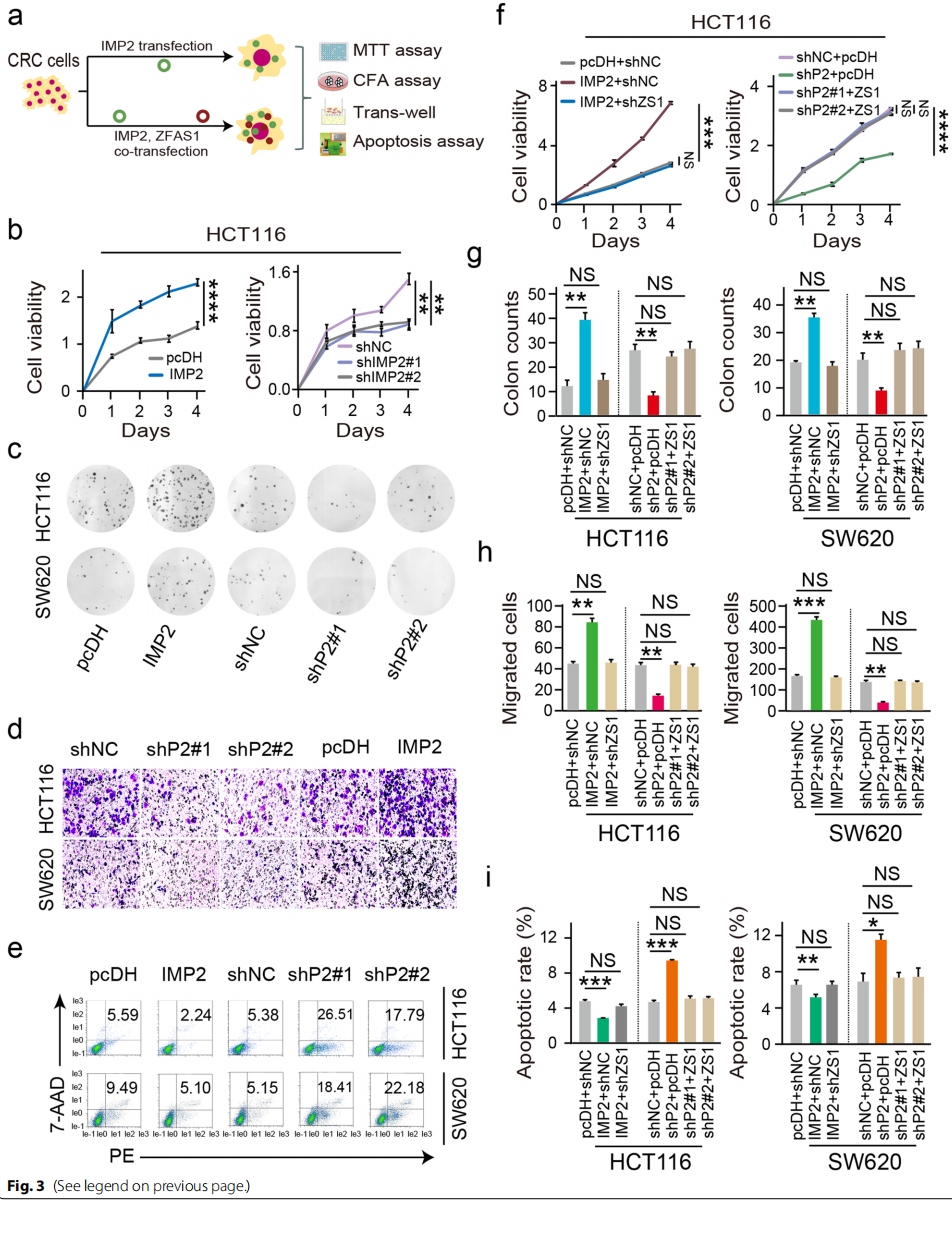 為了進(jìn)一步明確在CRC細(xì)胞中IMP2和ZFAS1特異性的調(diào)控模式,首先通過(guò)MTT實(shí)驗(yàn)(圖3b)和細(xì)胞克隆實(shí)驗(yàn)(CFA)(圖3c)分析了干擾IMP2表達(dá)后的HCT116和SW620細(xì)胞系的細(xì)胞增殖能力和細(xì)胞克隆能力。結(jié)果發(fā)現(xiàn)異位IMP2的表達(dá)顯著促進(jìn)了CRC細(xì)胞的生長(zhǎng)和克隆能力,而IMP2的耗竭抑制了CRC細(xì)胞的增殖。此外還檢測(cè)了細(xì)胞侵襲能力(圖3d),發(fā)現(xiàn)在沉默IMP2時(shí),細(xì)胞的遷移受到了明顯的抑制,而IMP2的過(guò)表達(dá)極大地提高了HCT116和SW620細(xì)胞系的侵襲能力。還發(fā)現(xiàn)IMP2的敲除增加了CRC細(xì)胞的凋亡率,IMP2的過(guò)表達(dá)會(huì)抑制CRC細(xì)胞的凋亡率(圖3e)。后續(xù)通過(guò)拯救實(shí)驗(yàn)表明ZFAS1的過(guò)表達(dá)逆轉(zhuǎn)了對(duì)CRC細(xì)胞的促進(jìn)作用,包括細(xì)胞增殖能力、細(xì)胞克隆能力、細(xì)胞遷移能力和細(xì)胞凋亡率(圖3f-i)。