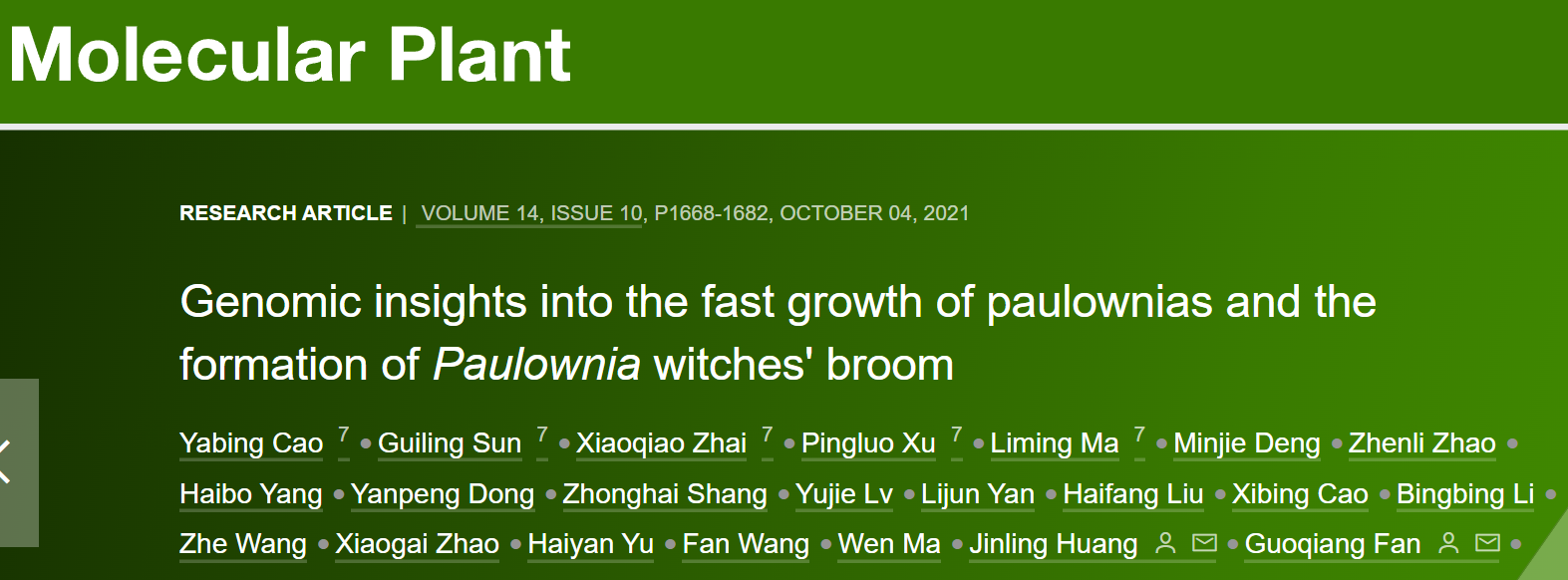 本研究通過PacBio技術(shù)組裝完成511.6 Mb泡桐基因組,contigN50=852.4 Kb;并通過Hi-C技術(shù)將93.2%序列錨定至20條假染色體上,多種評估結(jié)果表明本次構(gòu)建了高質(zhì)量染色體水平的白花泡桐基因組。研究進(jìn)一步基于白花泡桐及其叢枝植原體基因組測序和進(jìn)化分析,揭示了C3光合作用與景天酸代謝相結(jié)合提高光合效率的方式,是白花泡桐快速生長的關(guān)鍵因素。并通過WGCNA、轉(zhuǎn)基因、酵母雙雜交、雙分子熒光互補(bǔ)和免疫共沉淀等方式,闡明了泡桐叢枝植原體效應(yīng)因子PaWB-SAP54介導(dǎo)的PfSPLa泛素化引起了泡桐叢枝病的形成。該研究為加速泡桐的分子育種、品種改良及進(jìn)一步闡明泡桐叢枝病發(fā)生分子機(jī)制奠定了堅實(shí)基礎(chǔ)。