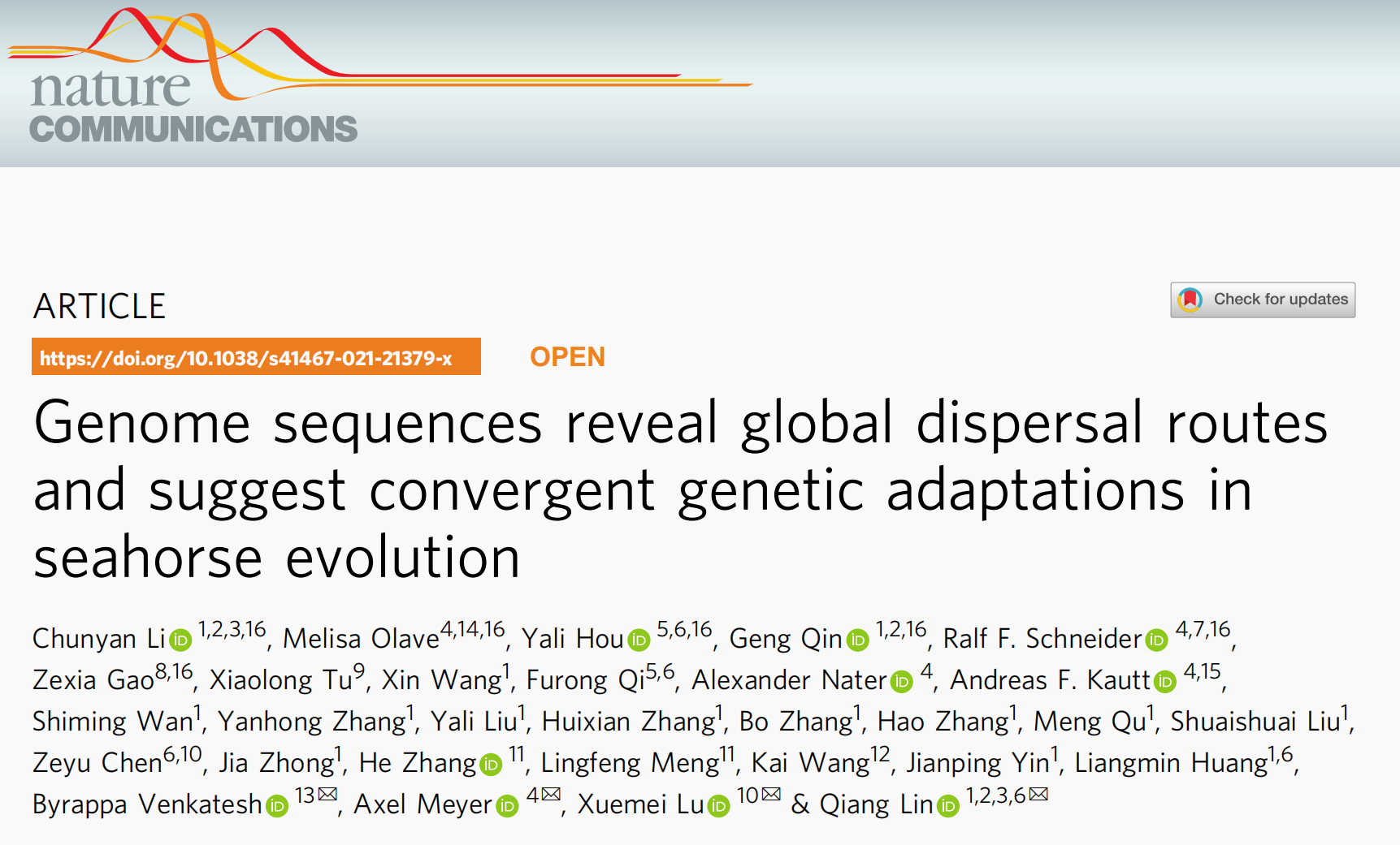 本研究利用PacBio和Hi-C技術(shù)重新組裝了雄性直立海馬的基因組,其組裝大小為420.66 Mb,contig N50=15.5Mb。并通過包含21個不同海馬種的358個海馬標(biāo)本重測序與進(jìn)化關(guān)系分析,研究了海馬在世界范圍內(nèi)的分布和生物地理格局。研究發(fā)現(xiàn)海馬在晚漸新世進(jìn)化,展示了其隨后的全球定居路線,并表示這種特征與洋流動態(tài)變化和古時期的海道開口有關(guān)。此外,反復(fù)出現(xiàn)的“骨刺”適應(yīng)性表型的遺傳基礎(chǔ)與一個關(guān)鍵發(fā)育基因的獨(dú)立替代有關(guān)。因此,分析表明,通過洋流漂流可以彌補(bǔ)分散性差的缺陷,并且快速適應(yīng)有利于海馬開拓新的棲息地。