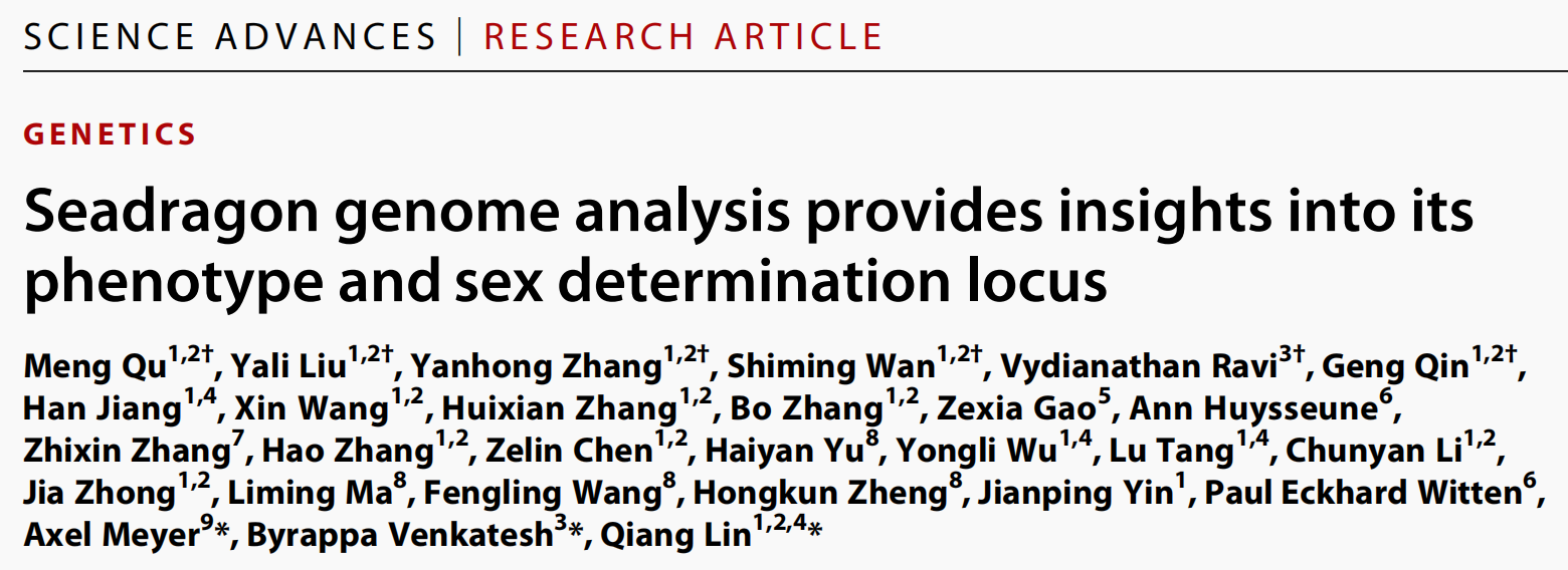 本研究完成雌雄性海龍基因組的破譯,草海龍最終組裝大小為 ~659 Mb(♂)與 ~663 Mb(♀), contig N50分別為10.0 Mb與12.1 Mb。綠海龍分別組裝~637 Mb(♂)與~648 Mb(♀),contig N50分別為18.0Mb與21.0 Mb。通過系統(tǒng)發(fā)育分析,明確草海龍與綠海龍在系統(tǒng)發(fā)育地位上屬于海龍亞科(Syngnathinae)的姊妹群,并于27.3 百萬年前左右發(fā)生分化。進(jìn)一步通過結(jié)合重測序分析、轉(zhuǎn)錄分析、比較基因組分析等研究揭示了草海龍適應(yīng)性進(jìn)化產(chǎn)物附葉的快速愈合和再生能力相關(guān)基因,以及海龍科物種性別決定基因的產(chǎn)生和演化歷程,為海洋魚類的環(huán)境適應(yīng)性進(jìn)化研究提供了重要理論依據(jù)。