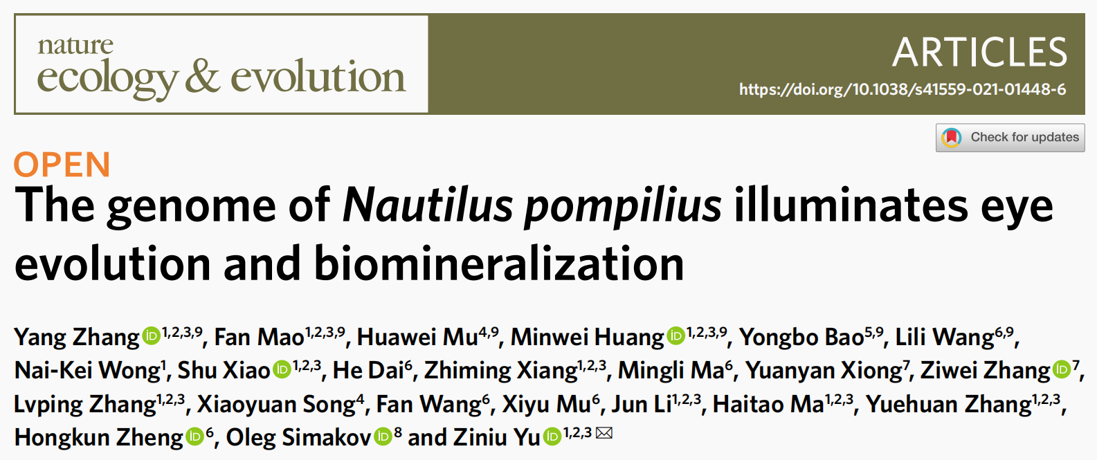 本研究基于PacBio平臺組裝了被測序的頭足類動物中基因組*小的物種-鸚鵡螺基因組,其組裝大小為730.58 Mb,contigN50=1.1Mb,BUSCO評估為91.31%。通過鸚鵡螺基因組測序和進(jìn)化分析,揭示了針孔眼形成和生物礦化的演變規(guī)律,并結(jié)合轉(zhuǎn)錄組、蛋白組、基因家族及系統(tǒng)發(fā)育等分析對針孔眼、殼形成機(jī)制進(jìn)行了深入剖析。研究表明Hox簇完整性的破壞可能與軟體動物譜系中外殼的進(jìn)化丟失有關(guān)。鸚鵡螺基因組中晶狀體發(fā)育的關(guān)鍵轉(zhuǎn)錄因子NRL/Maf的缺失和晶狀體形成蛋白的基因家族收縮,共同促進(jìn)了鸚鵡螺針孔眼的形成。相關(guān)的研究成果對鸚鵡螺的生物學(xué)研究、遺傳資源保護(hù)以及頭足動物的適應(yīng)性演化都將發(fā)揮重要的推動作用。