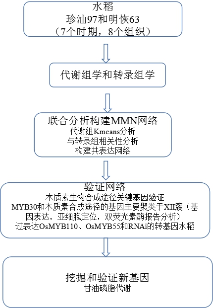 該研究利用代謝組和轉(zhuǎn)錄組聯(lián)合分析,對秈稻品種珍汕97和明恢63整個(gè)生命周期不同組織的樣品進(jìn)行測定,結(jié)合轉(zhuǎn)錄和代謝數(shù)據(jù)構(gòu)建了水稻全生育期主要組織器官的代謝調(diào)控網(wǎng)絡(luò)(RMRN)并精準(zhǔn)識別了調(diào)節(jié)關(guān)鍵代謝產(chǎn)物積累的調(diào)控基因,利用已知的轉(zhuǎn)錄因子作為誘餌來篩選木質(zhì)素代謝新的調(diào)控網(wǎng)絡(luò),以及根據(jù)組織特異性無偏見地識別新的甘油磷脂代謝調(diào)控因子。該研究不僅對水稻基礎(chǔ)研究和育種實(shí)踐具有重要意義,大數(shù)據(jù)資源促進(jìn)水稻生長調(diào)控、抗性和營養(yǎng)品質(zhì)方面的改良研究。并對其他作物全生育期代謝組學(xué)研究提供借鑒。