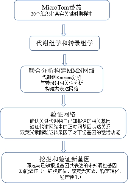 利用番茄代謝組和轉(zhuǎn)錄組數(shù)據(jù)集,通過整合番茄20個(gè)組織和發(fā)育時(shí)期的代謝組和轉(zhuǎn)錄組數(shù)據(jù),繪制了番茄整個(gè)生長發(fā)育過程中主要代謝變化的整體圖譜,同時(shí)還發(fā)現(xiàn)調(diào)節(jié)重要次級代謝產(chǎn)物(類黃酮和甾體類生物堿)合成的關(guān)鍵調(diào)控因子,為深入解析番茄主要代謝物的轉(zhuǎn)錄調(diào)控網(wǎng)絡(luò)奠定了基礎(chǔ),并為模式和非模式植物代謝調(diào)控的深入研究提供了新思路。